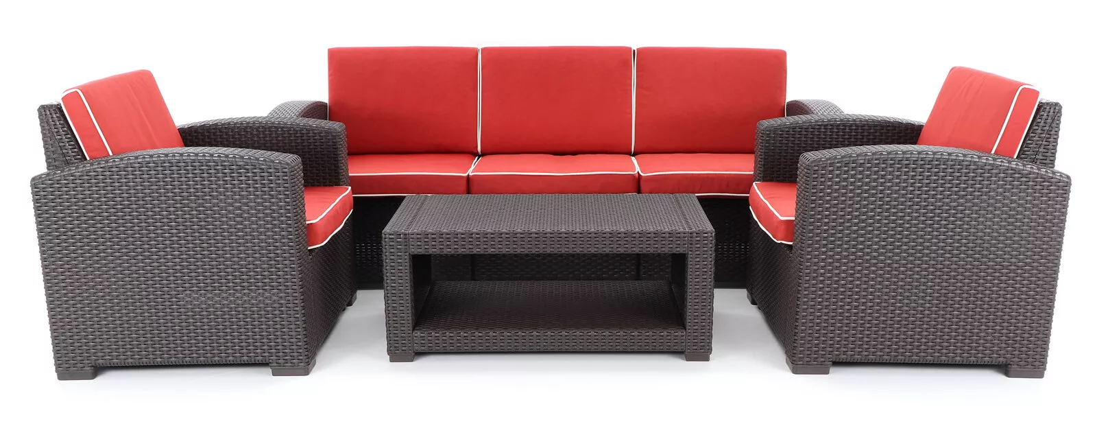 - Nábytek PORTORIKO RED DeLuxe má originální povrchovou strukturu napodobující přírodní ratan. Ideální pro pohodlné venkovní posezení na vaší zahradě či terase.