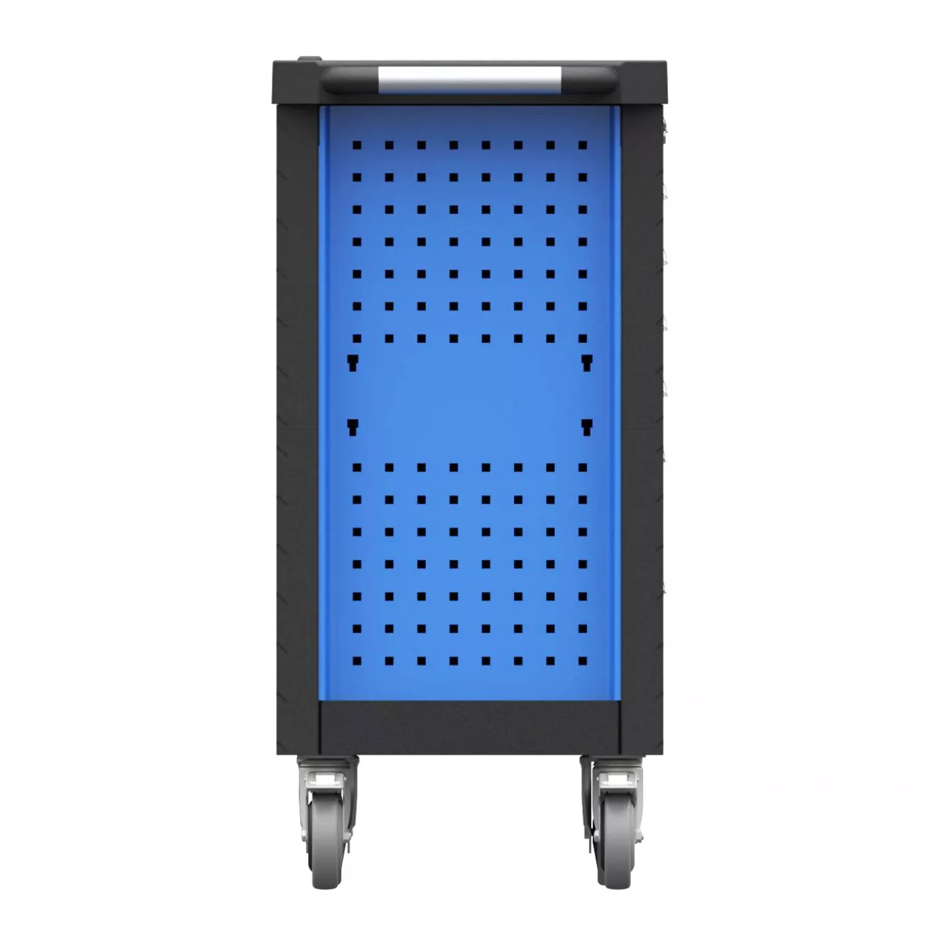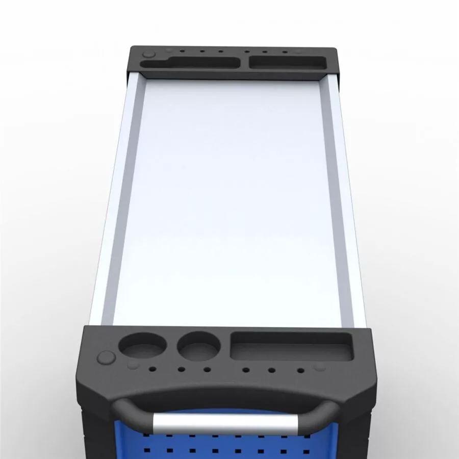 - Vrchní (nerezová) odkládací plocha se zvýšenými okraji (přihrádkami) • děrované boční stěny pro upevnění závěsných držáků (Q-systém; otvory 1 cm2) • svislé hrany vozíku vč