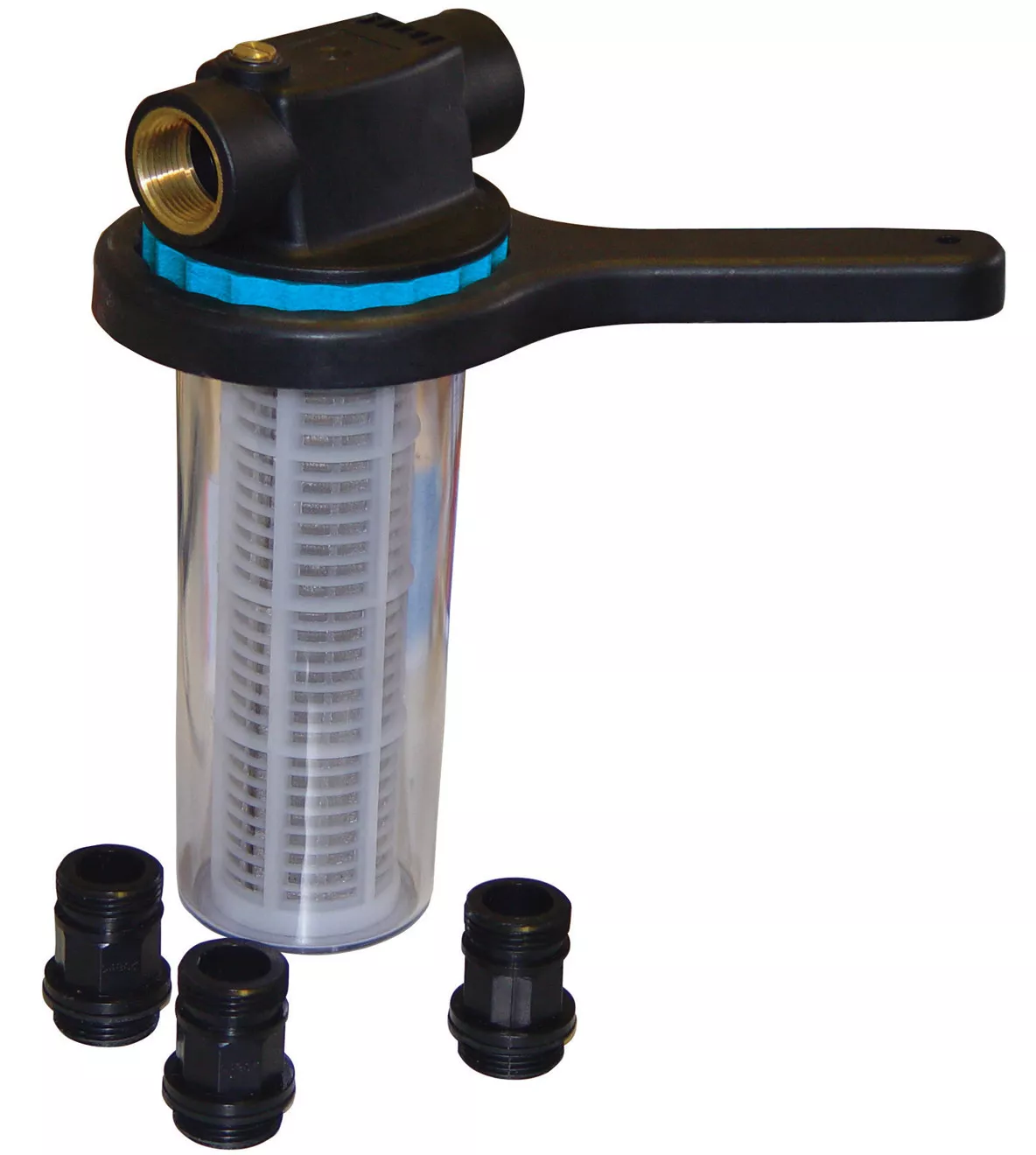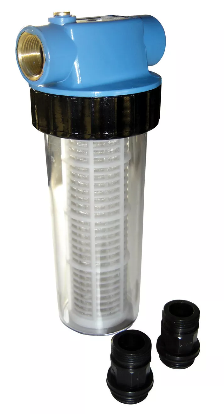 - Kompletní předsazený filtr s oboustrannou závitovou přípojkou 1“, určený k preventivní ochraně domácích vodáren před nasátím písku/pevných částic.