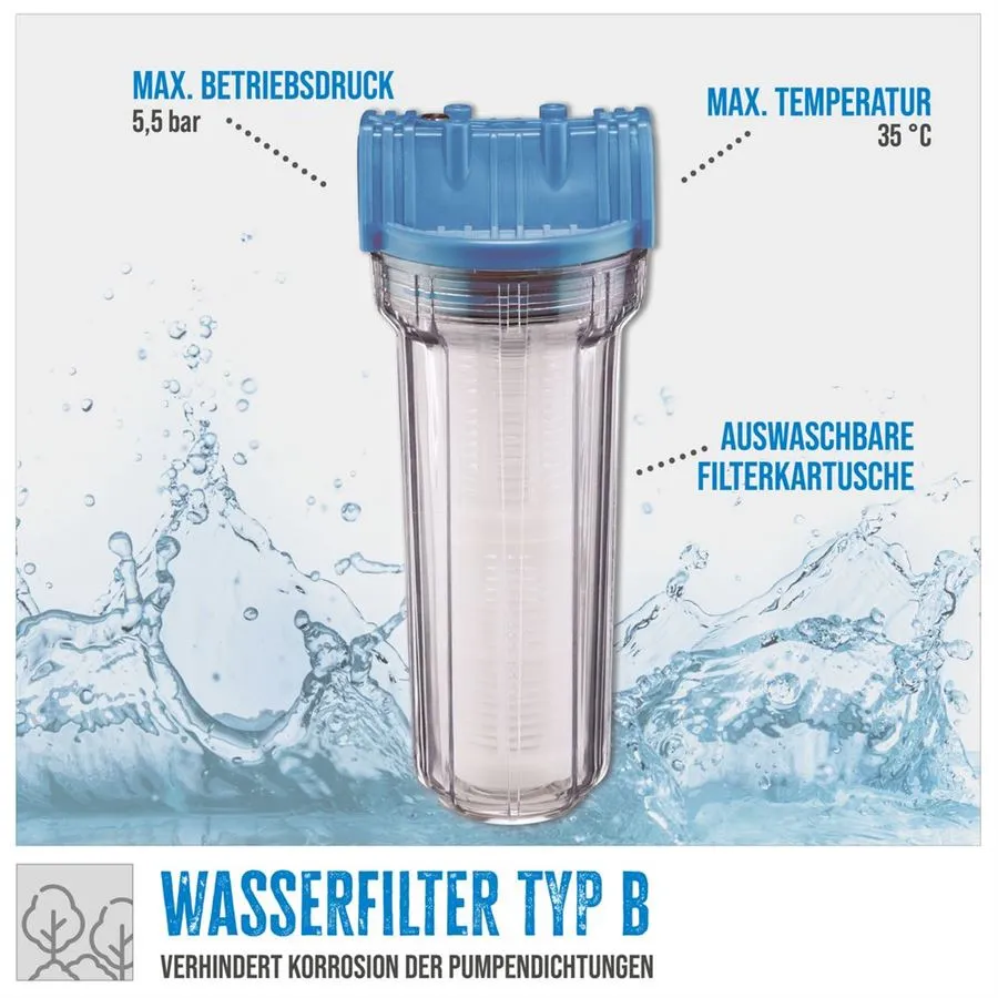 - Konstrukce: průhledná nádobka z PVC, omyvatelné filtrační kartuše, včetně 2 závitových redukcí