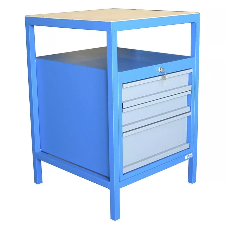 - Vybavení: 3 zásuvky (-> 2 x výška 100 mm/1 x výška 180 mm, bezpečnostní zarážky proti neúmyslnému vysunutí, centrální uzamykání cylindrickým zámkem, 2 klíče); odkládací plocha pod pracovní deskou; nohy stolu z uzavřených ocelových profilů (-> 4 příčné stabilizační výztuže)