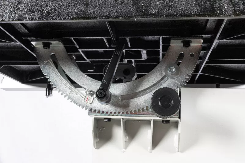 - Stůl je vybaven podélným vodícím a úhlovým příložníkem. Pila je opatřena přírubou pro
