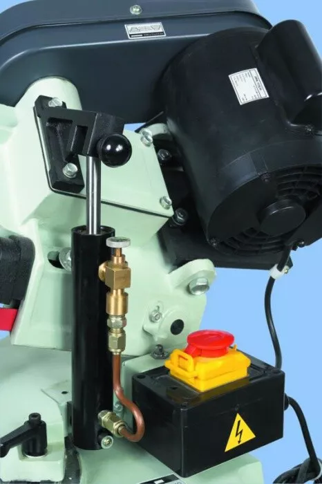 - Cenově výhodná pásová pila na kov s optimálním řezným výkonem je díky snadné obsluze, hydraulickému a chladicímu zařízení vhodná i pro náročnější kutily, kteří nepotřebují oboustranné úhlování ramena. Rychlost plynulého klesání ramene pily lze korigovat za pomocí ventilu na hydraulickém válci, který lze i snadno odstranit. Řeznou rychlost pilového pásu lze manuálně nastavit na požadovanou polohu klínového řemene na řemenici, která pak následně přenáší pohyb přes šnekovou převodovku v olejové lázni na pásovici s pilovým pásem. Chladící systém je zabudovaný ve stabilním mobilním podstavci. Volba rychlosti padání ramene, k tomu optimální řezná rychlost a chlazeníkapalinou v místě řezu, prodlužují životnost pilového pásu až na trojnásobek. Koncový vypínač zastavuje pilový pás po ukončení řezu u tohoto modelu automaticky. Řez pod úhlem 0-45° se provádí nastavením pevné čelisti svěrákudle stupnice umístěné na základně. Součásti dodávky pásové pily na kov PPK-115HC/230:• Pilový pás