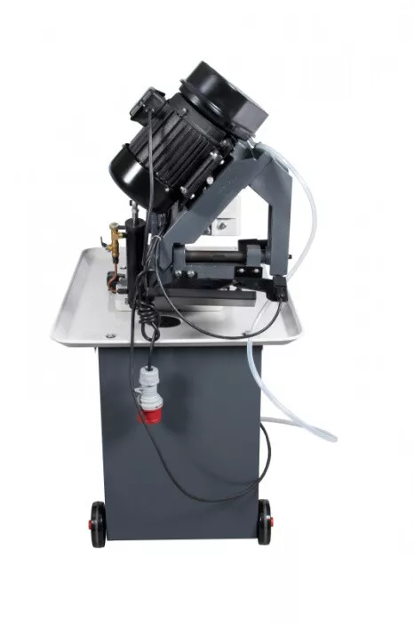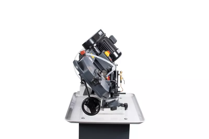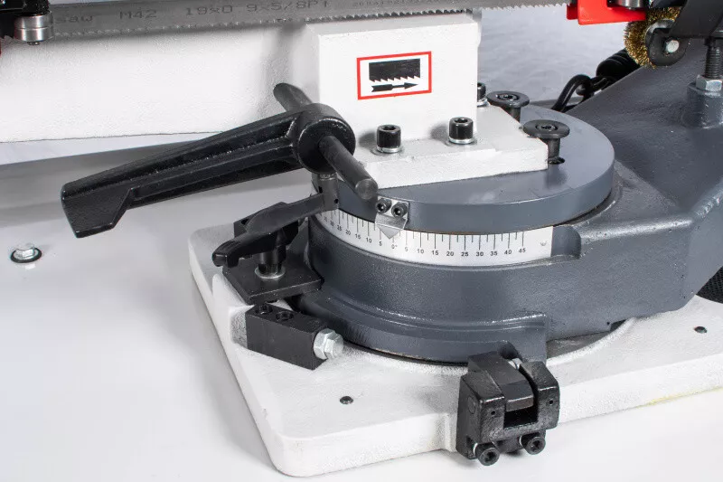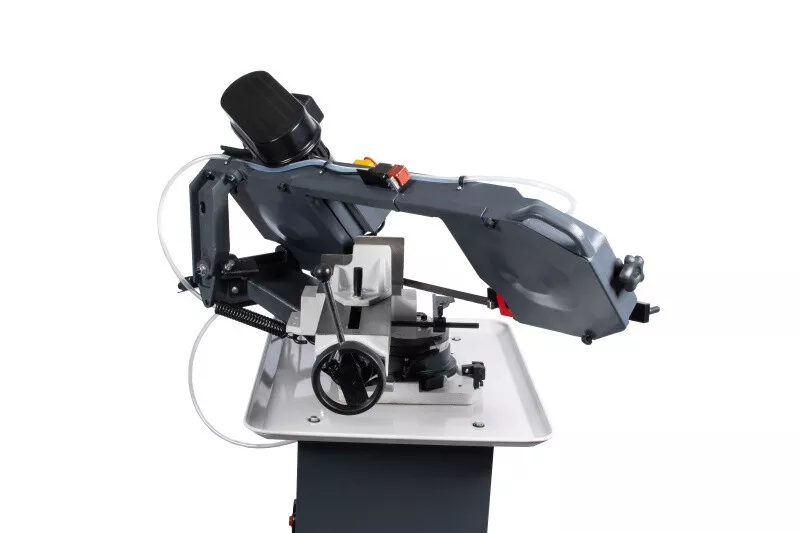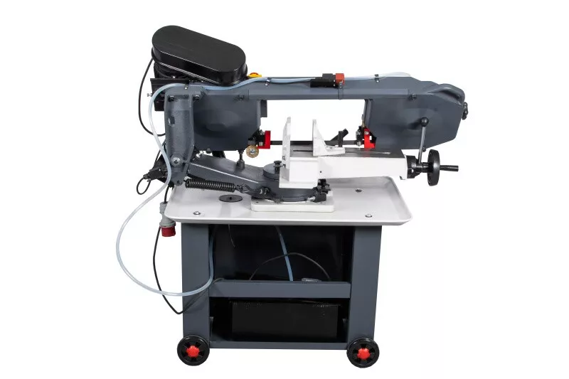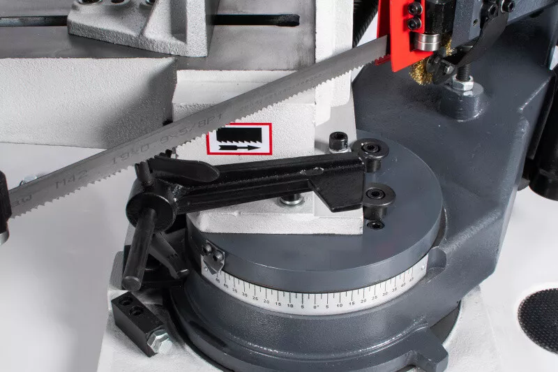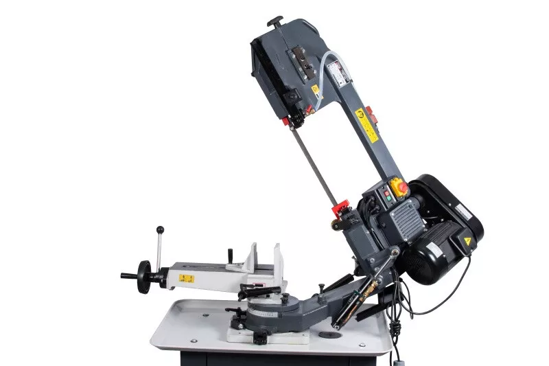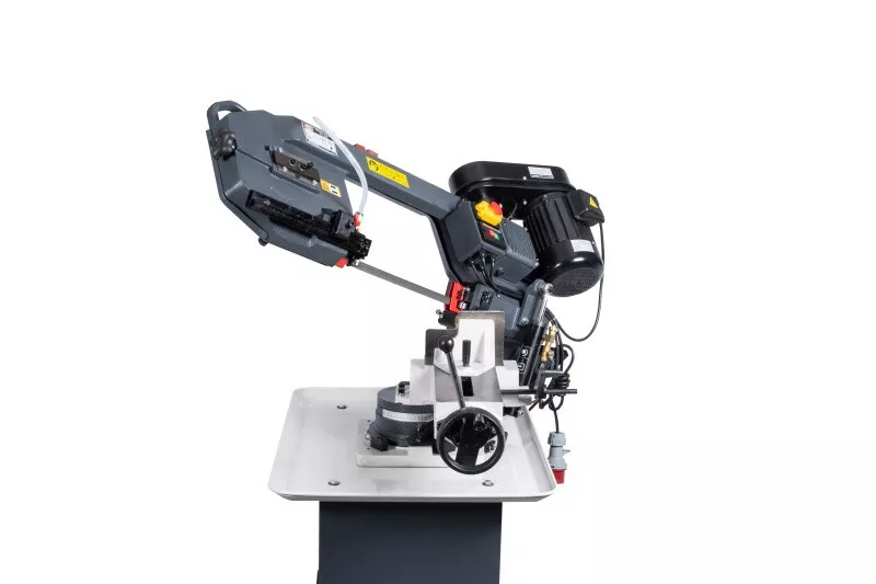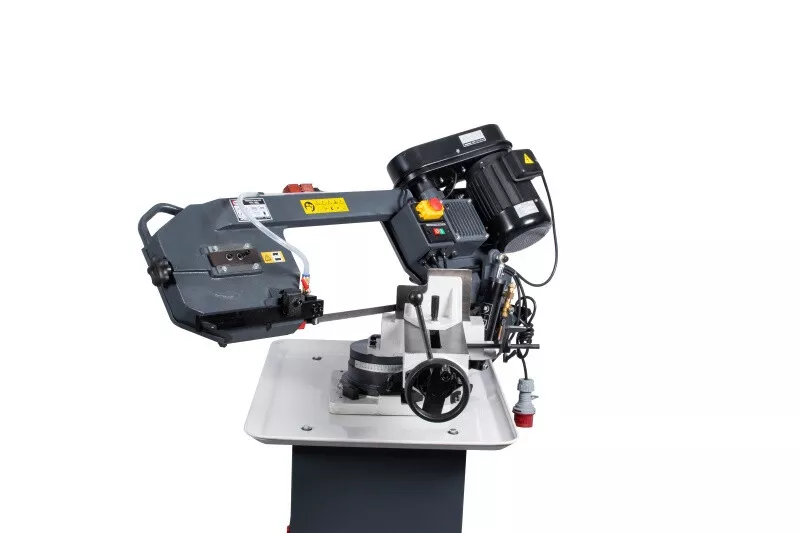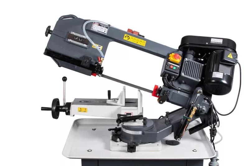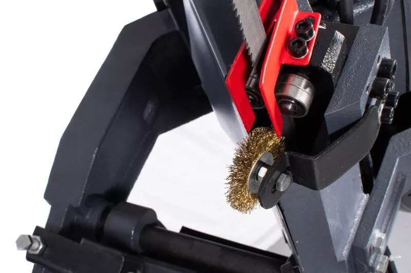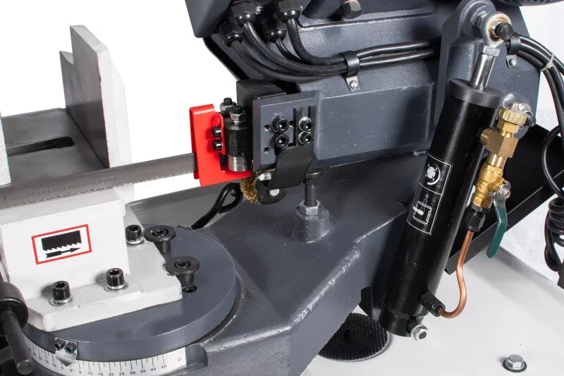 - Cenově výhodná pásová pila na kov s optimálním řezným výkonem je díky snadné obsluze, hydraulickému a chladicímu zařízení vhodná i pro náročnější kutily, kteří nepotřebují oboustranné úhlování ramena. Rychlost plynulého klesání ramene pily lze korigovat za pomocí ventilu na hydraulickém válci, který lze i snadno odstranit. Řeznou rychlost pilového pásu lze manuálně nastavit na požadovanou polohu klínového řemene na řemenici, která pak následně přenáší pohyb přes šnekovou převodovku v olejové lázni na pásovici s pilovým pásem. Chladící systém je zabudovaný ve stabilním mobilním podstavci. Volba rychlosti padání ramene, k tomu optimální řezná rychlost a chlazeníkapalinou v místě řezu, prodlužují životnost pilového pásu až na trojnásobek. Koncový vypínač zastavuje pilový pás po ukončení řezu u tohoto modelu automaticky. Řez pod úhlem 0-45° se provádí nastavením pevné čelisti svěrákudle stupnice umístěné na základně. Součásti dodávky pásové pily na kov PPK-115HC/230:• Pilový pás