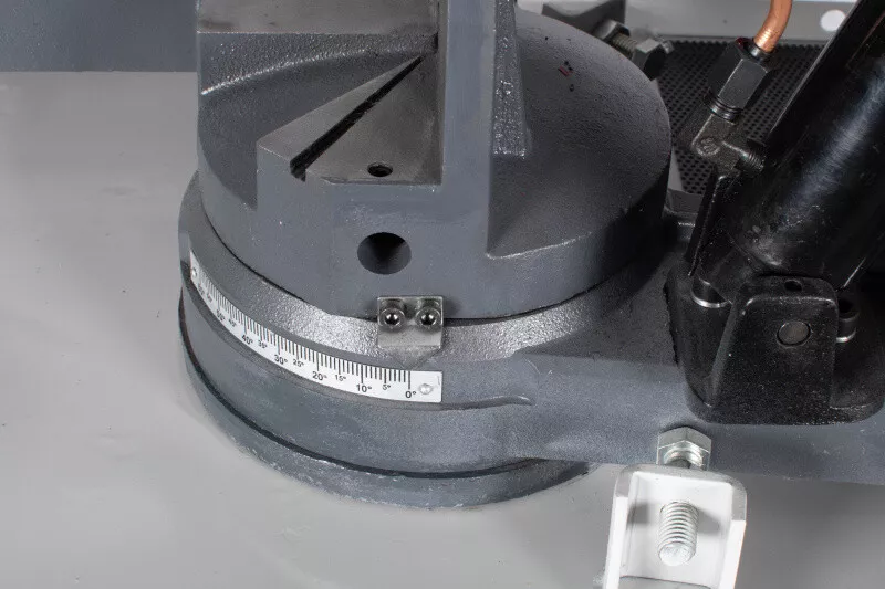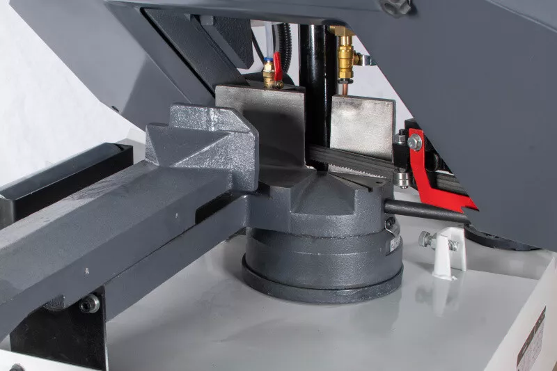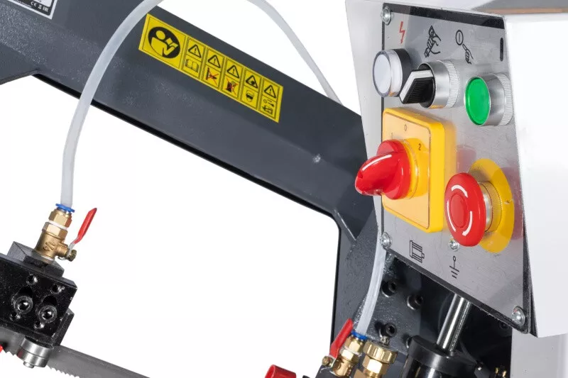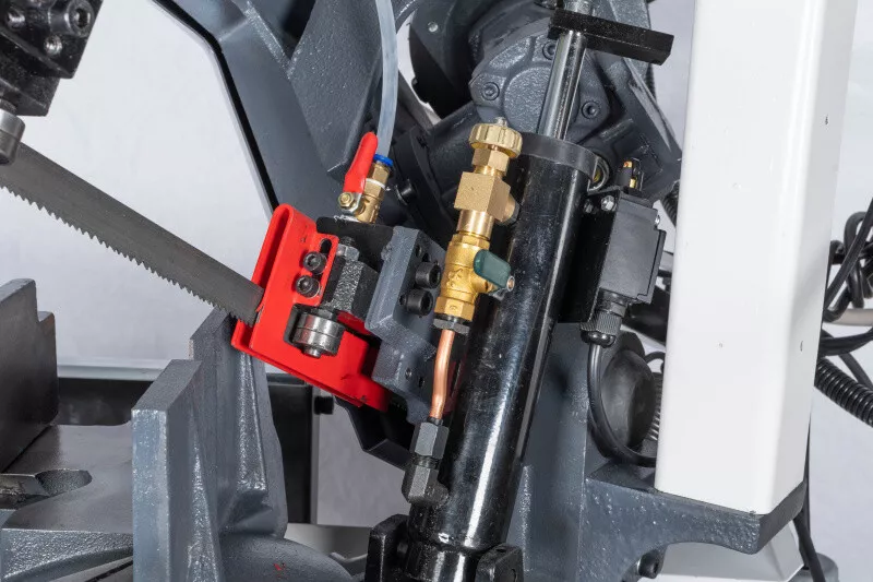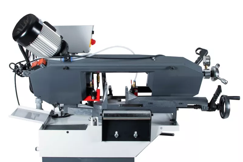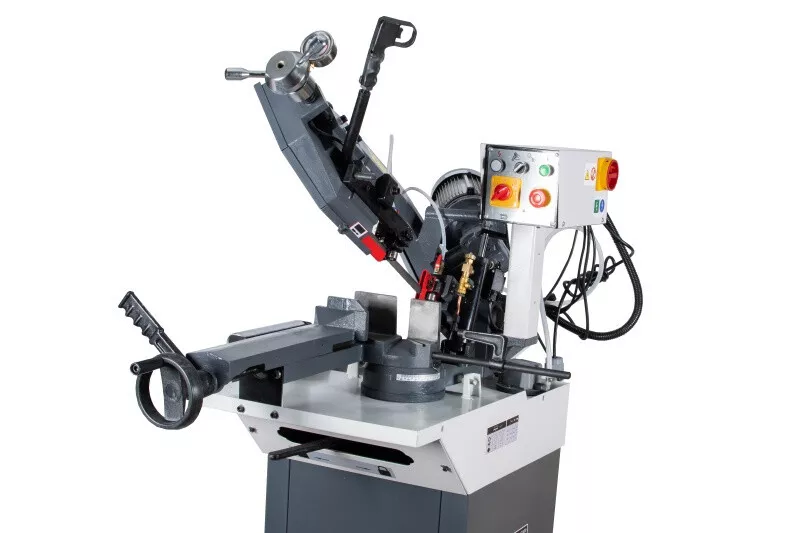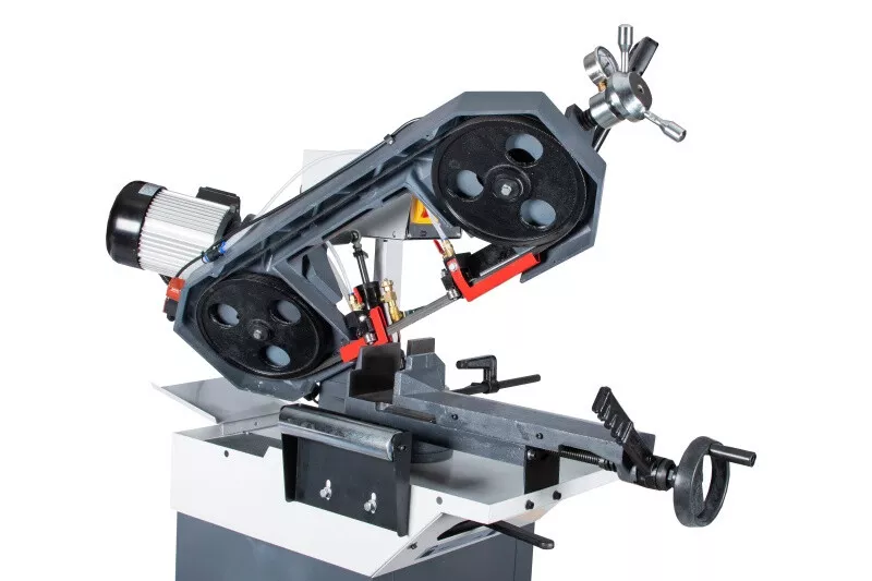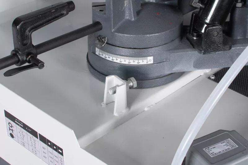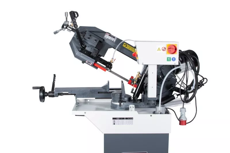 - Cenově výhodná pásová pila na kov s optimálním řezným výkonem je díky snadné obsluze, hydraulickému a chladicímu zařízení vhodná i pro náročnější kutily, kteří nepotřebují oboustranné úhlování ramena. Rychlost plynulého klesání ramene pily lze korigovat za pomocí ventilu na hydraulickém válci, který lze i snadno odstranit. Řeznou rychlost pilového pásu lze manuálně nastavit na požadovanou polohu klínového řemene na řemenici, která pak následně přenáší pohyb přes šnekovou převodovku v olejové lázni na pásovici s pilovým pásem. Chladící systém je zabudovaný ve stabilním mobilním podstavci. Volba rychlosti padání ramene, k tomu optimální řezná rychlost a chlazeníkapalinou v místě řezu, prodlužují životnost pilového pásu až na trojnásobek. Koncový vypínač zastavuje pilový pás po ukončení řezu u tohoto modelu automaticky. Řez pod úhlem 0-45° se provádí nastavením pevné čelisti svěrákudle stupnice umístěné na základně. Součásti dodávky pásové pily na kov PPK-115HC/230:• Pilový pás
