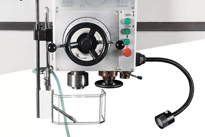 - tuhá a masivní konstrukce velký rozsah posuvů vřetena změna otáček za pomocí převodovky manuální řazení vybaveno koncovými dorazy vřetena tlačítko chlazení a hlavní elektrický panel je na sloupu mechanický systém mazání dodáváno včetně upínací kostky