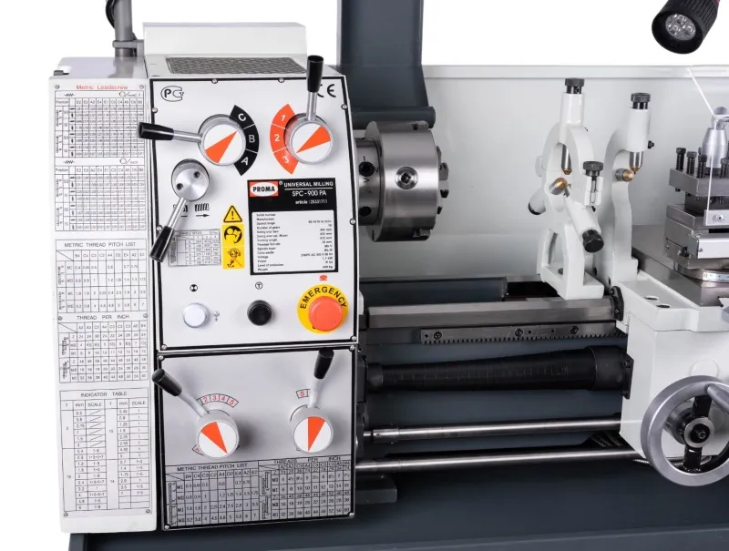 - Soustruh PROMA SPC-900PA spadá do skupiny strojů, které jsou učeny pro náročné zámečnické a opravárenské dílny a školy. Díky silné konstrukci lože a vysoké hmotnosti 450 kg nabízí vysokou přesnost. Tento typ stroje je standardně vybaven jak vodicím a tažným vřetenem pro řezání závitů, tak i automatickým podélným a příčným posuvem.