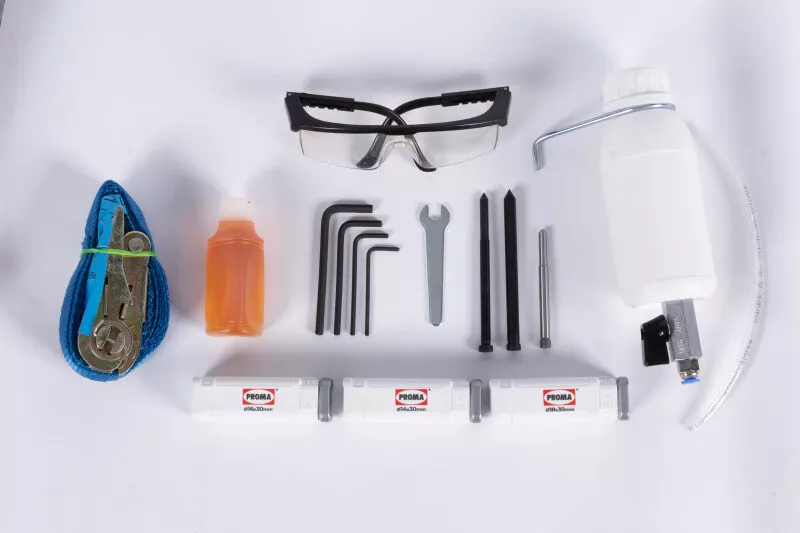 - Vrtačka je dodávána v plastovém kufru s příslušenstvím tak, že ji z obchodu můžete odnést přímo do provozu a začít pracovat. Balení obsahuje jádrové vrtáky s vodícími hroty o průměrech 14, 16, 18 mm x 30mm, ale také olejový koncentrát, který lze naředit na požadovaný poměr a součástí jsou i ochranné pracovní brýle.