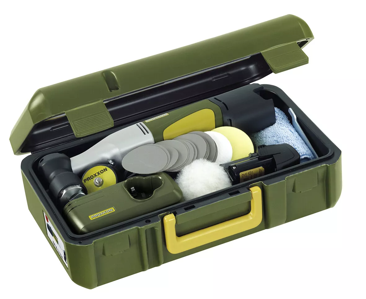 - Součástí dodávky je 1ks lithium-iontová baterie Li-A2 (10,8 V), 1ks rychlonabíječka LG/A2, 1ks gumový podpůrný kotouč 50 mm se suchým zipem, 1ks lešticí houba (středně tvrdá), 1ks kotouč z jehněčího rouna, 1ks filcový kotouč pro leštění kovů a neželezných kovů (střední tvrdost), 12ks brusných kotoučů (hrubost 2000) a 1ks hadřík z mikrovláken.