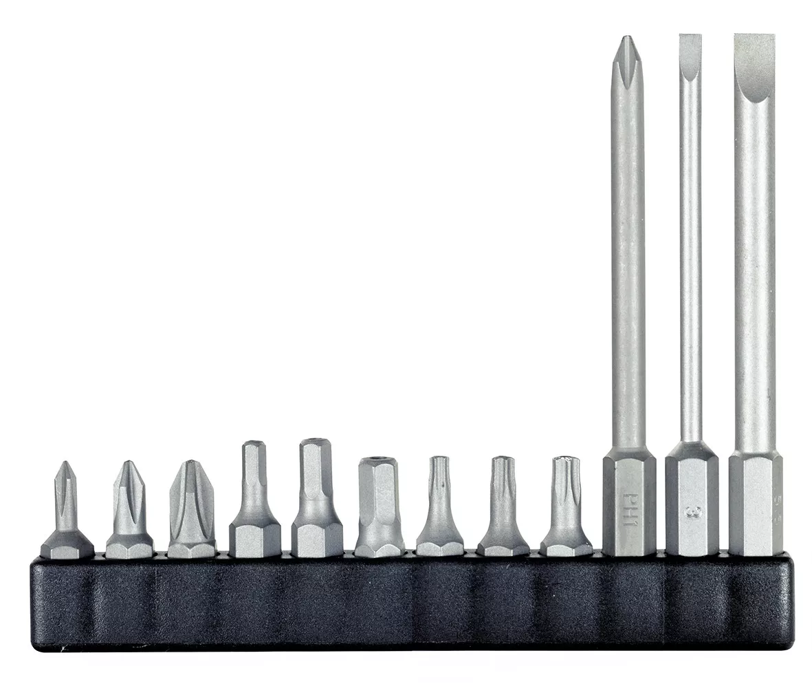 - Součástí balení je nabíječka s USB konektorem a 12 standardních bitů v průmyslové kvalitě, včetně 3 prodloužených.