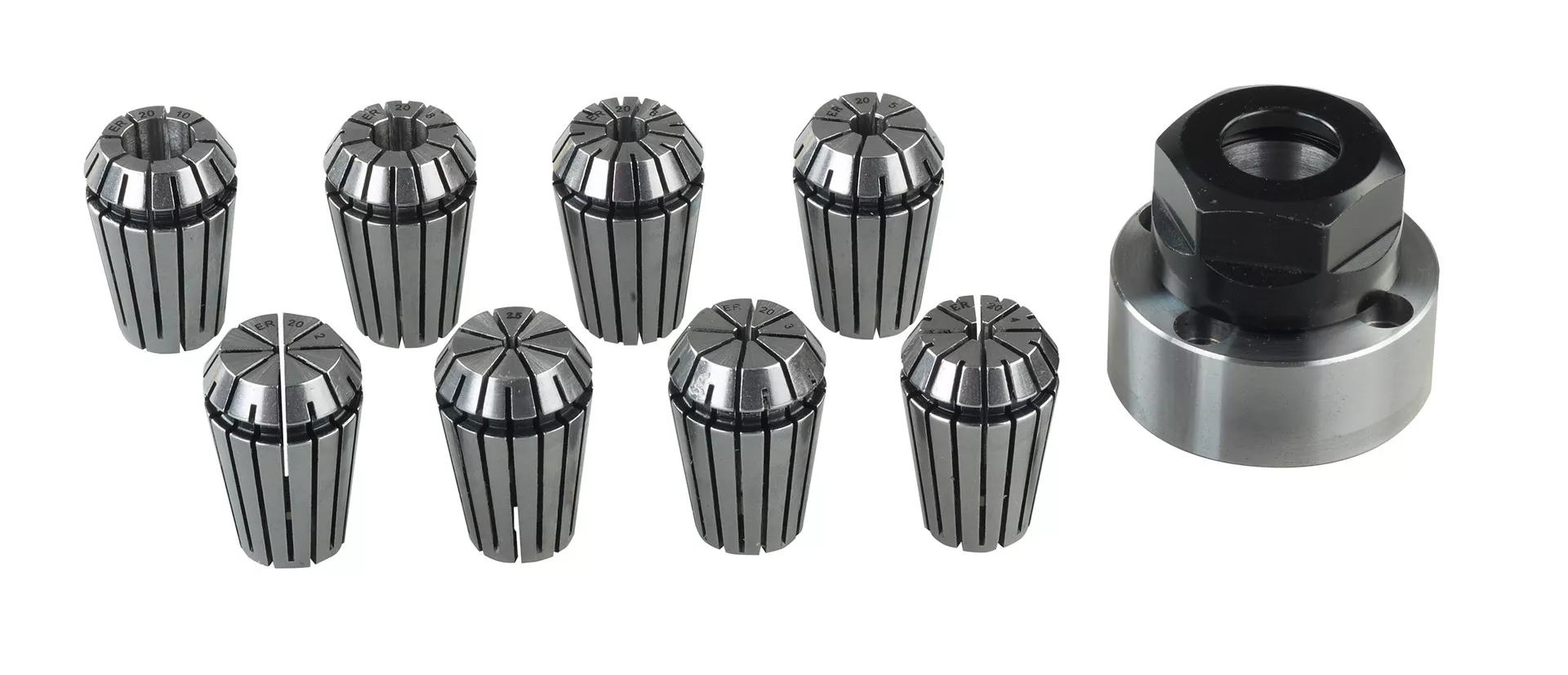 - Průchozí průměr kleštiny lze zmenšit až o 0,5 mm jmenovitého průměru kleštiny. Sada obsahuje celkem 8 ks kleštin vnitřního průměru 2 - 2,5 - 3 - 4 - 5 - 6 - 8 - 10 mm a převlečnou matici, která pasuje na hřídel soustruhu PD 250/E.