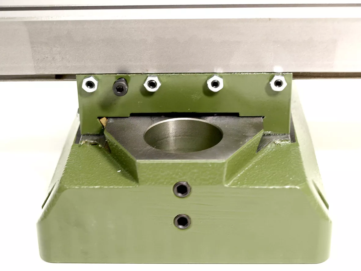 - Frézování je pak ve všech osách bez jakékoliv vůle. Na konci podstavce je otvor pro upnutí sloupu Frézky PF 230 Ø 35mm, který se následně zajistí imbus šrouby proti vychýlení.