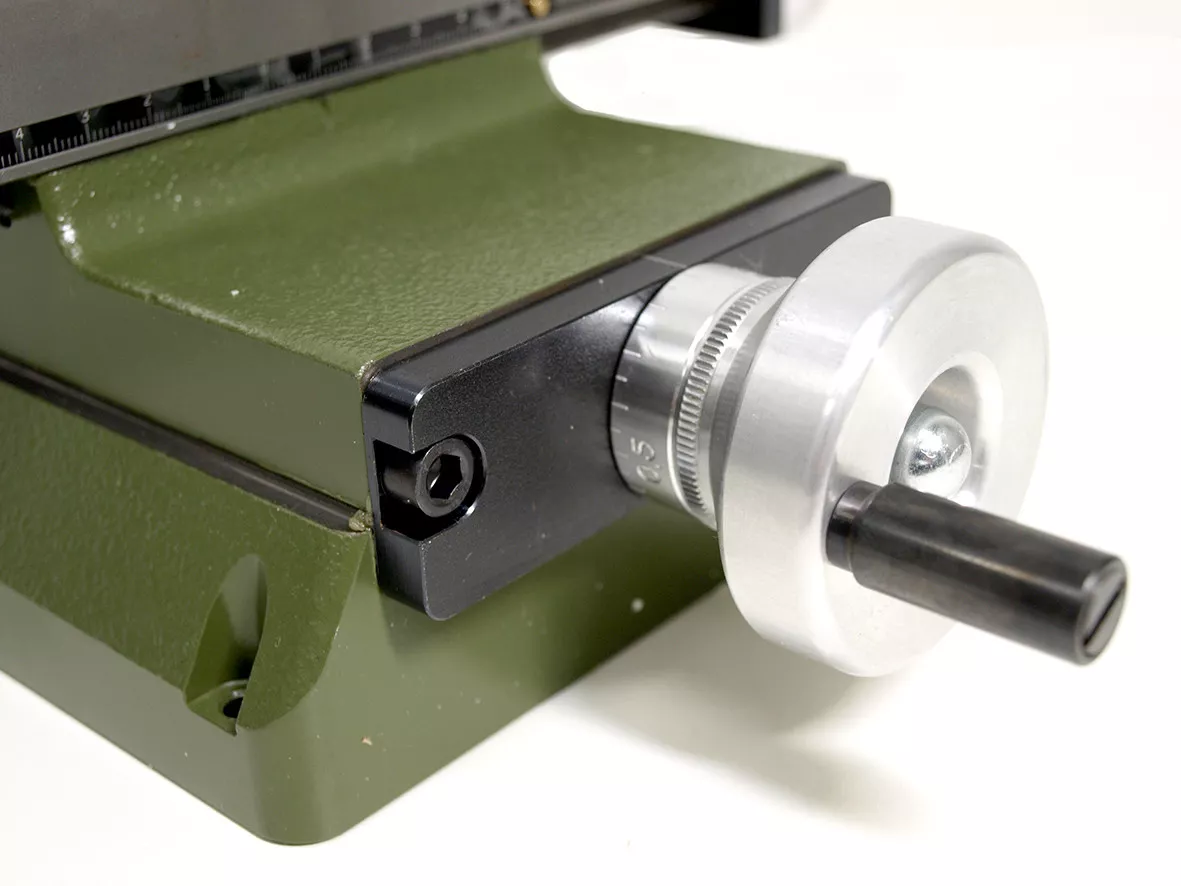 - Horizontální pohyb zajišťují ovládací kola (1 ot. = 1 mm; 1 dílek = 0,05 mm), která přesně přesunou saně stolu.