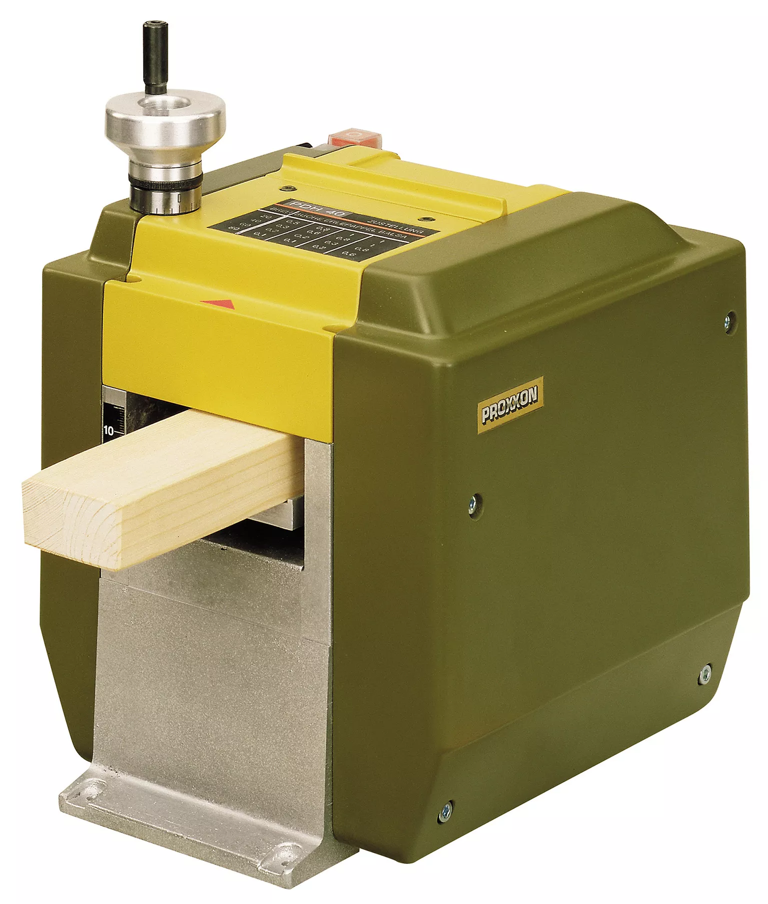 - Trojitě uložený hoblovací stůl (z hliníkového tlakového odlitku, rovinně frézovaného), se může nastavit pomocí ovládacího kolečka (se stupnicí od 0) s přesností na 1/10 mm.Automatický, rovnoměrný posuv s pojistkou proti zpětnému rázu: odpružený, rýhovaný válec může posouvat i nepravidelné tvary dřeva.