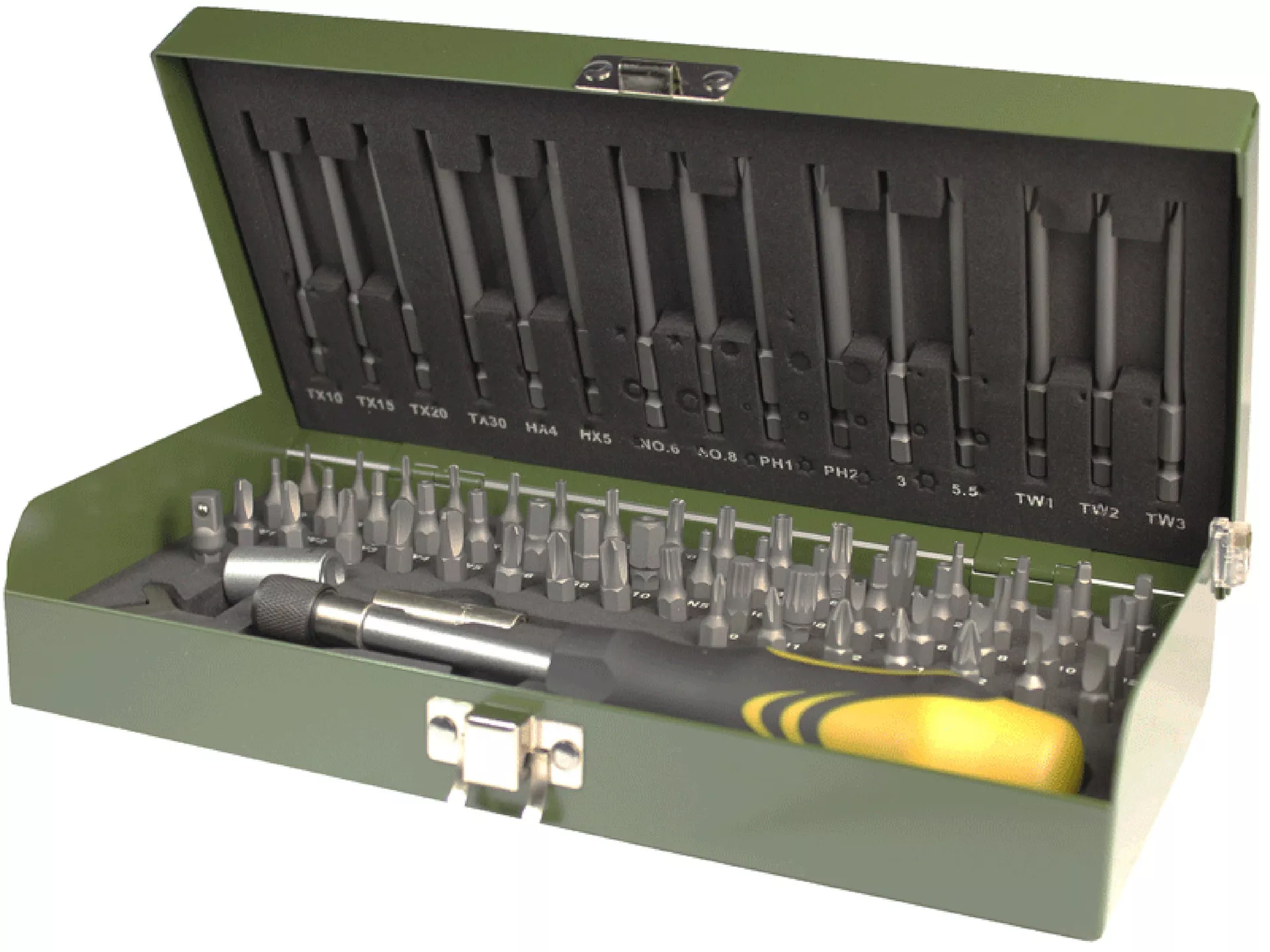 - Ve spodní části sady naleznete 55ks standardních bitů délky 25mm, a to: Torx s vnitřním otvorem TX 5 - 6 - 7 - 8 - 9 - 10 - 15 - 20 - 25 - 27 - 30 - 40; čtyřhranné bity SQ 00 - 01 - 02 - 03; Imbus s vnitřním otvorem HX 2 - 2,5 - 3 - 4 - 5 - 6 - 8mm; 6hranné bity Imbus v palcových rozměrech 5/64 - 3/32 - 7/64 - 1/8 - 9/64 - 5/32; Motýlkové bity C 1 - 2 - 3; Bity 3křídlo TW 1 - 2 - 3 - 4 - 5; Bity 4křídlo TS 6 - 8- 10; Bity 12hranné XZN 5 - 6 - 8; Dvojtečka č. 4 - 6 - 8 - 10 - 12; Phillips PH 0 - 1 - 2; Pozidrive PZ 1 - 2; Plochý 3 - 5,5mm.Součástí sady je dále šroubováková rukojeť s pružinovým upínáním bitů; Magnetický držák bitů pro práci s elektrickým šroubovákem nebo vrtačkou; Adaptér 4hran na 6hran; Adaptér s vnitřním 4hranem a 6hranem dle DIN 3126; Speciální nástavec "Y" pro centrické uchopení šroubů s okem a podobných dílů. Materiálové provedení bitů odpovídá průmyslové kvalitě; jsou rozměrově přesné a odolné proti opotřebení.