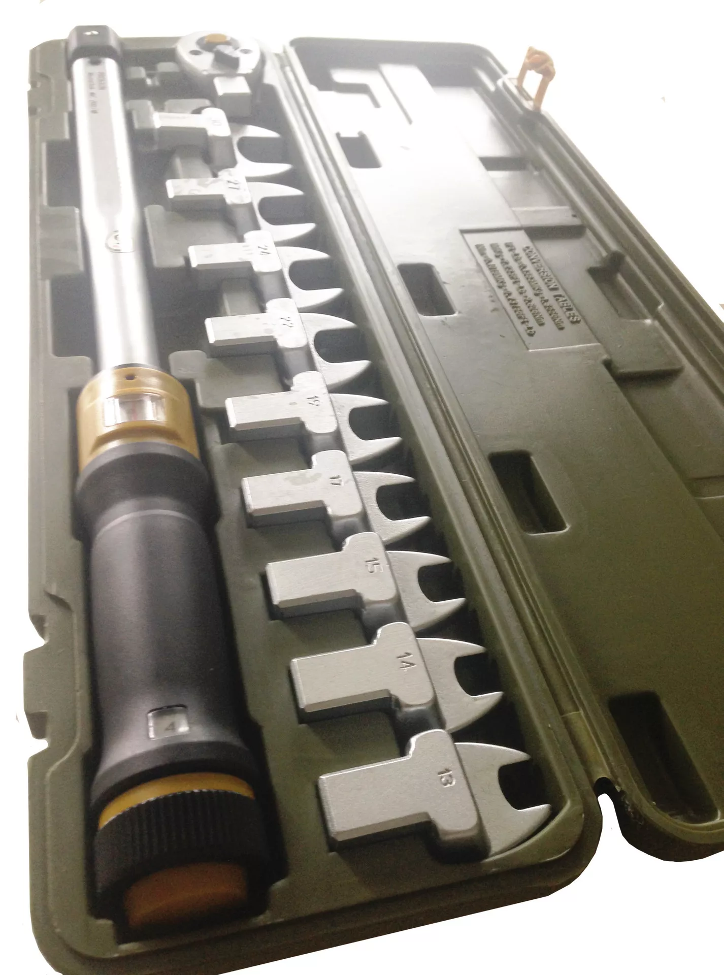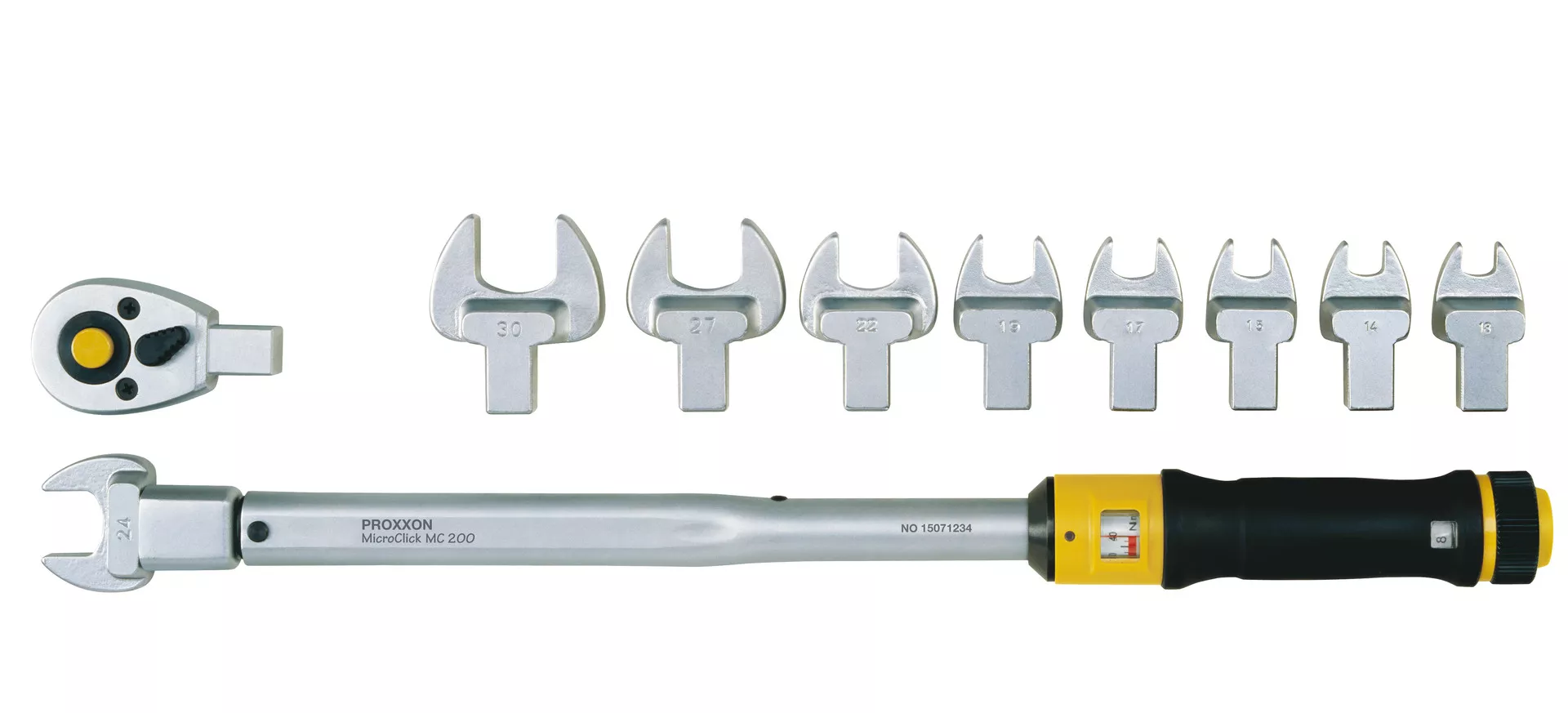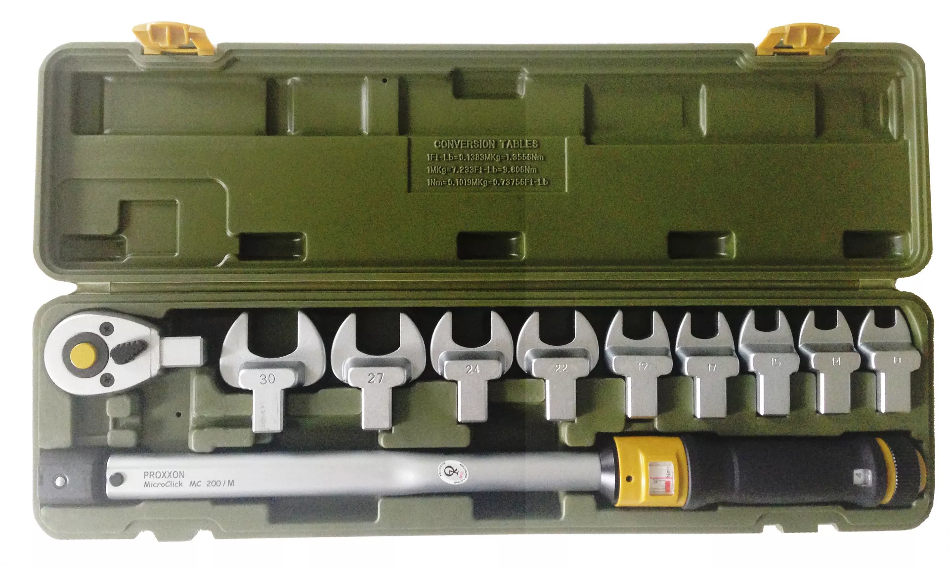 - Součástí balení je sada 9 nástavců velikosti 13 – 14 – 15 – 17 – 19– 22 – 24 – 27 a 30 mm, dále 1ks ráčnové hlavy a samotný momentový klíč.