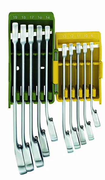 - Kompletní 10-dílná sada obsahuje ráčnové očkoploché klíče vel. 8 - 10 - 11 - 12 - 13 - 14 - 16 - 17 - 18 - 19 mm s přepínám.
