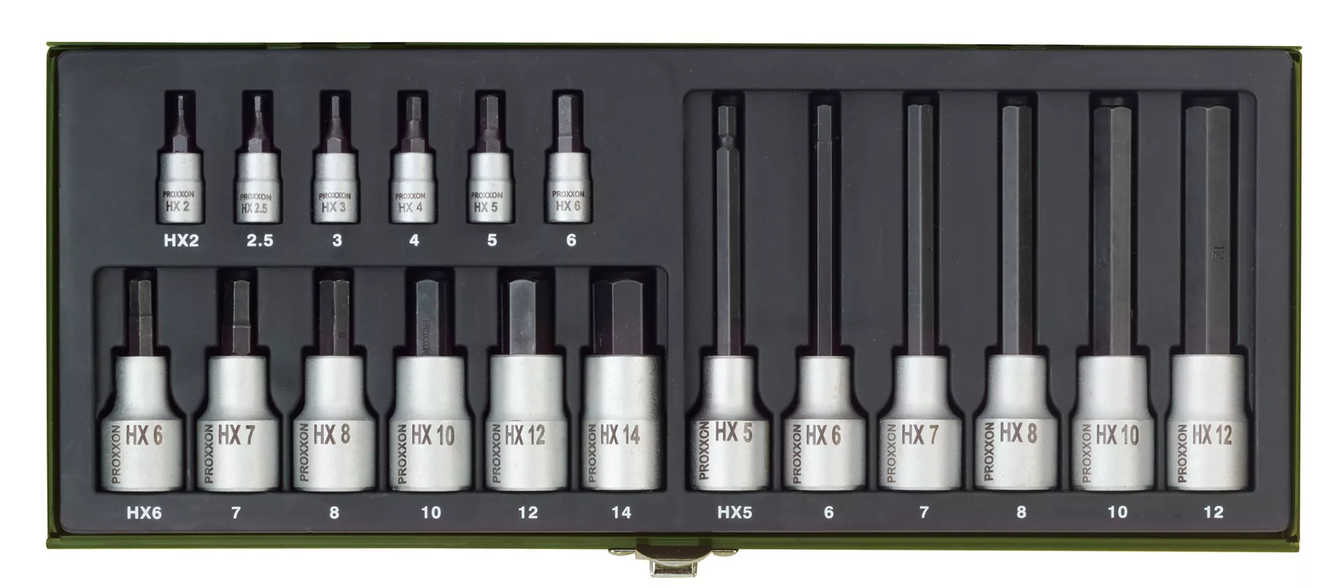- Kompletní 18-dílná sada obsahuje zástrčné hlavice Inbus délky 33mm pro 1/4" uchycení HX 2 -2,5 - 3 -4 - 5 - 6mm (6ks); zástrčné hlavice Inbus délky 55mm pro 1/2" uchycení HX6 - 7 - 8 - 10 - 12 - 14mm (6ks) a zástrčné hlavice Inbus délky 100mm pro 1/2" uchycení HX5 - 6 - 7 - 8 - 10 - 12mm (6ks).