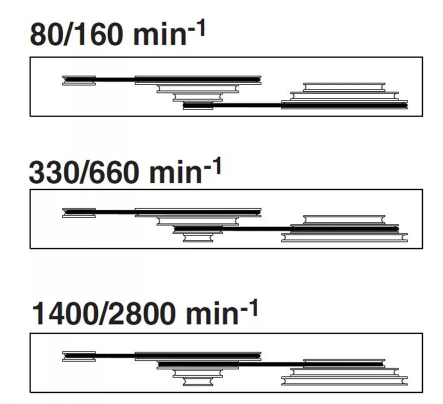 - Soustruh je poháněn silným tichým motorem s možností šesti rychlostí otáčení vřetene nastavitelných přesouváním hnacího řemene v rozsahu 80 - 2.800/min.