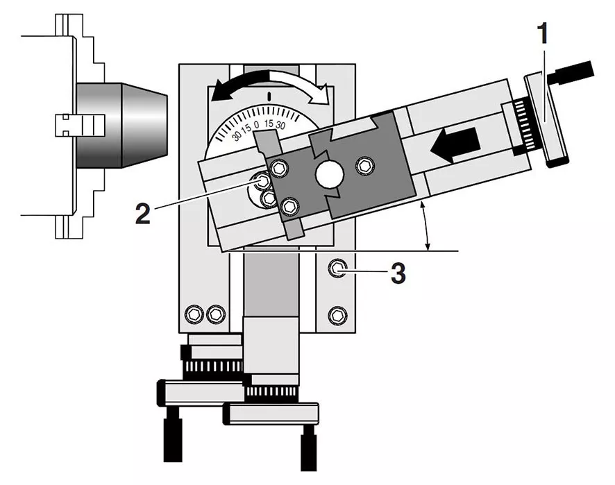- Horní saně jsou otočné až do 45° se stupnicí pro soutružení kuželů.