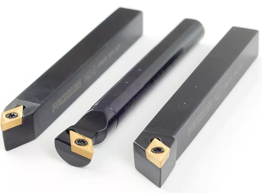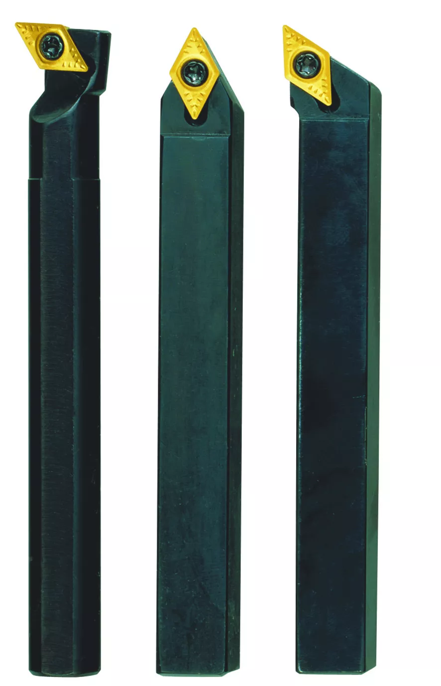 - Sada obsahuje celkem 3ks soustružnických držáků, a to pro vnější soustružení (hrubování a zarovnávání), přímý soustružnický držák (drážkování, podélné soustružení) a držák pro soustružení v otvorech (do díry) od prům. 12mm.Tvrdokovové (povlakované) břitové destičky s úhlem 55° jsou uchyceny k držáku šroubem Torx.