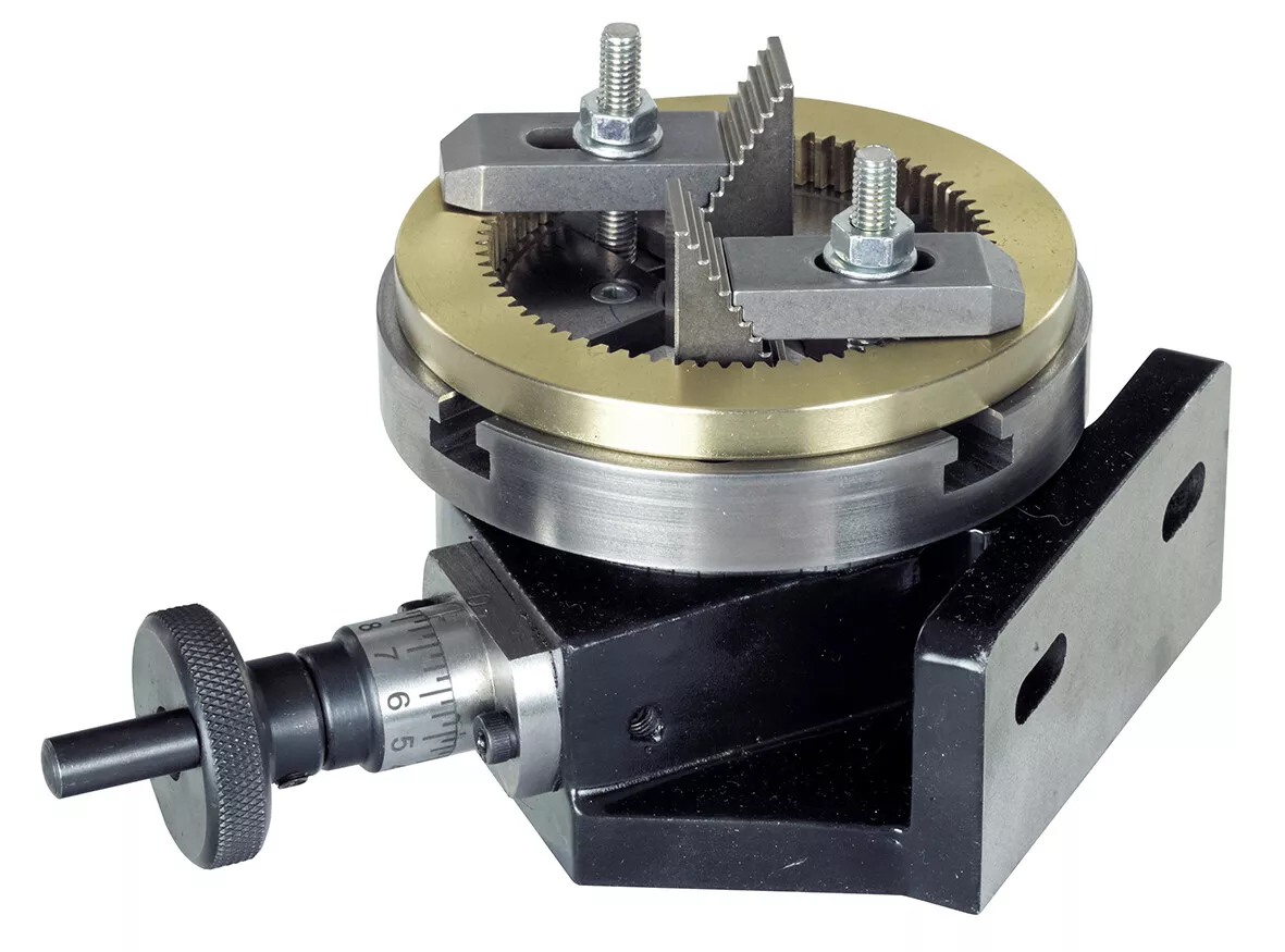 - Nastavení posuvu regulačním kolečkem se stupnicí s nastavitelnou nulou (1 otáčka = 10°). Zařízení lze upnout vertikálně nebo horizontálně ke křížovému stolu s T-drážkou v rozmezí 45 – 60 mm.