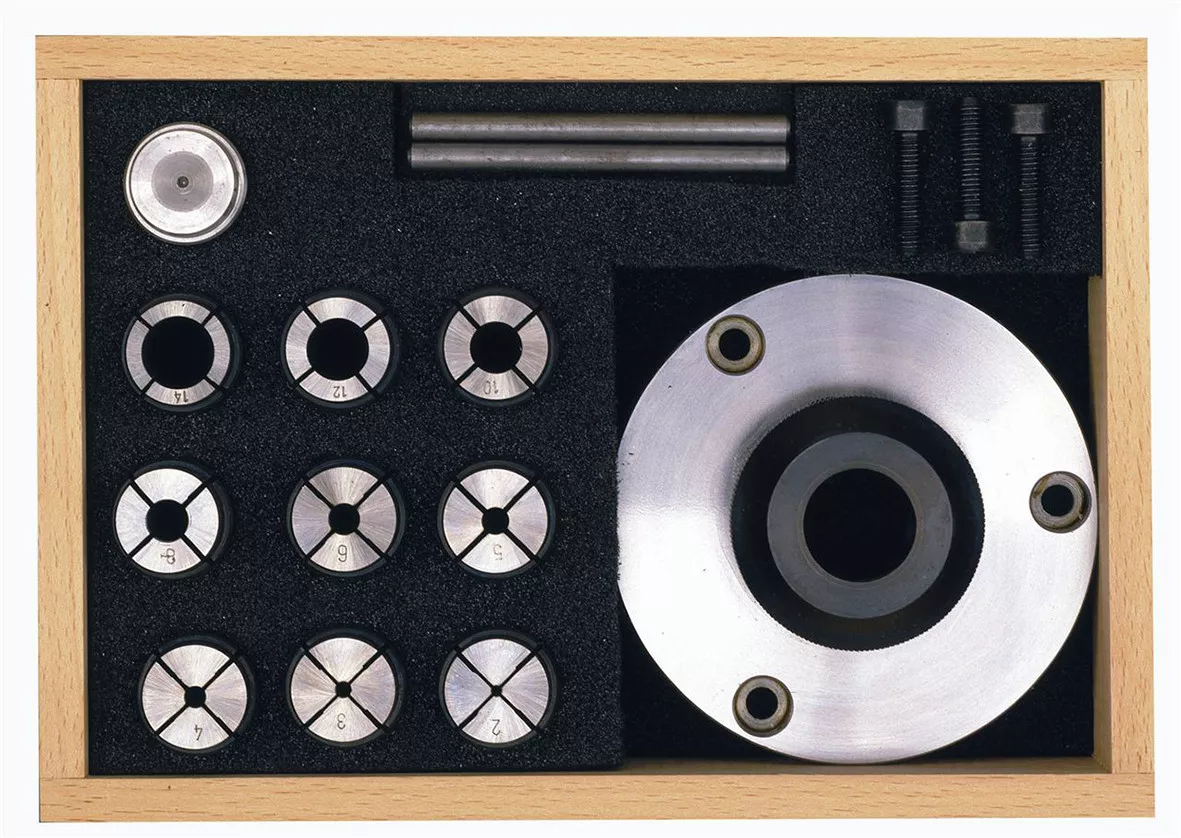 - Sada obsahuje celkem 9 ks kleštin vnitřního průměru 2 – 3 – 4 – 5 – 6 – 8 – 10 – 12 a 14 mm a upevňovací desku s převlečnou matici.