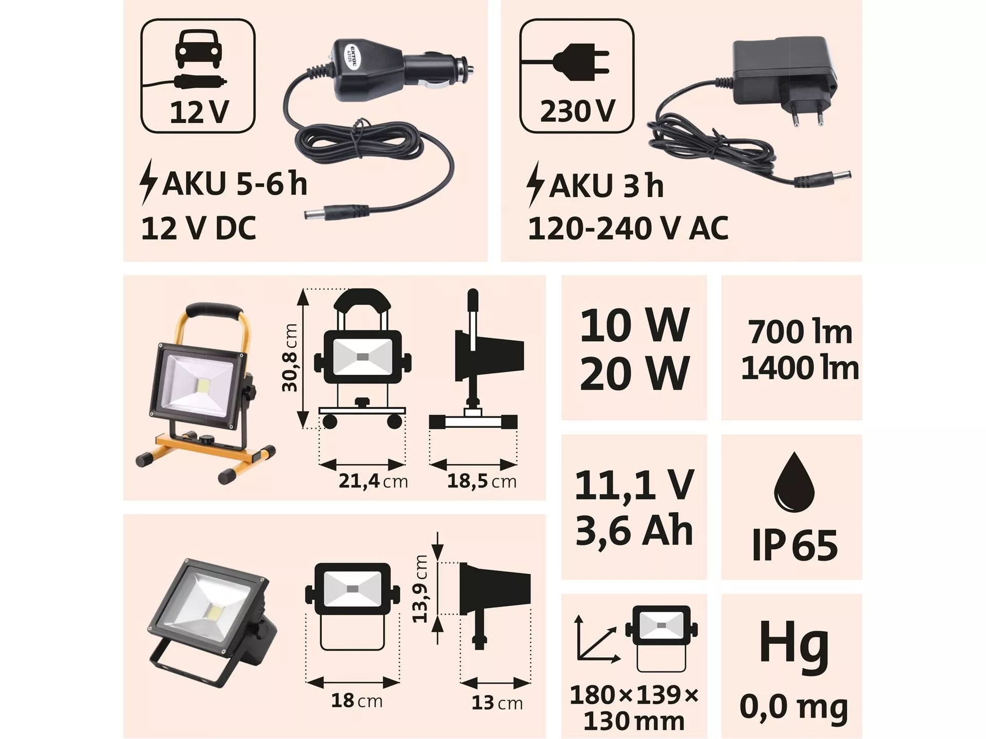 - Přenosný LED nabíjecí reflektor je zdrojem příjemného bílého světla, které kvalitou odpovídá dennímu světlu. LED diody mají nízkou spotřebu energie při vysoké intenzitě světla. Reflektor lze používat jako přenosný zdroj světla se stojánkem bez napájecího kabelu a bez nutnosti připojení ke zdroji el. proudu, protože zdrojem el. energie je předem nabitý akumulátor. Je vybavena přepínačem mezi 10 a 20W a speciálním elektrickým obvodem „Constant current“, který dodává v nastavení 10W konstantní proud po dobu cca 6h a v nastavení 20W po dobu cca 4h a tím zajišťuje po tuto dobu max. světelný výkon svítilny bez klesání intenzity světla a poté se svítilna vypne. Díky možnosti nabíjení z 12V zásuvky automobilu, malým rozměrům, mechanické odolnosti, odolnosti proti dešti, lze svítilnu mít jako součást výbavy automobilu a jako zdroj světla při práci, kempování, rybaření, na zahradě apod.