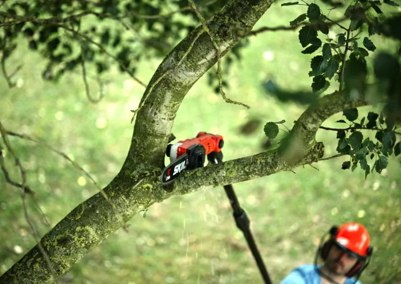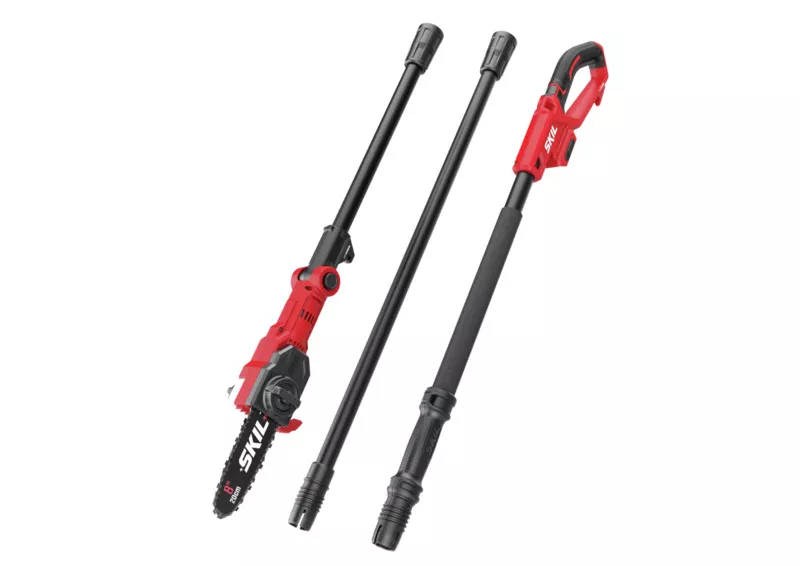 - SKIL 0650 „20V Max“ (18 V) je akumulátorová pila na tyči na prořezávání těžko dostupných a vysoko položených větví bez žebříku.