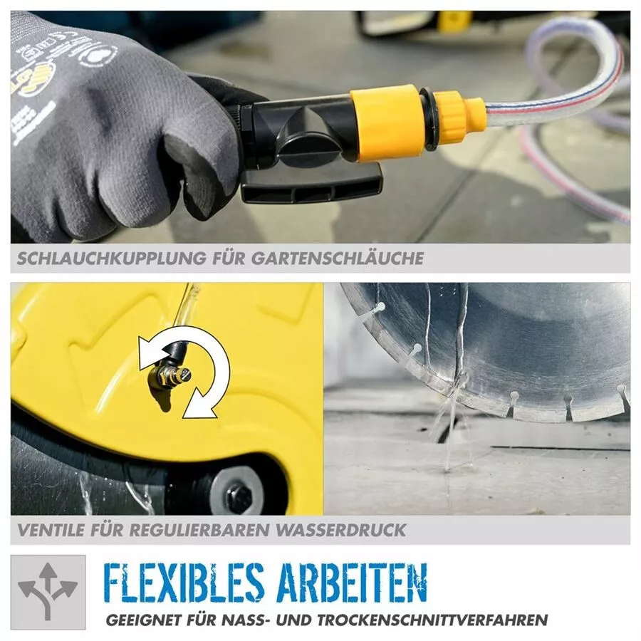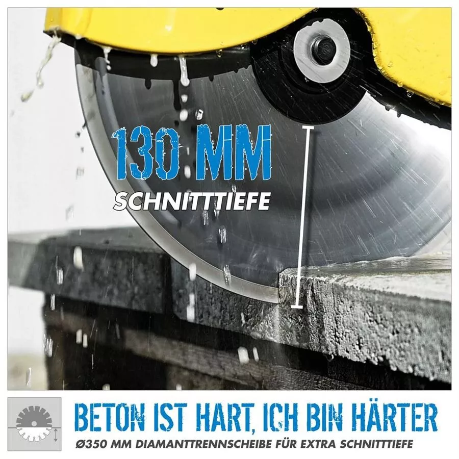 - hloubka řezu až 130 mm.Robustní pojezdová kolečka, usnadňující vedení řezačky po rovných (hladkých) plochách • snadné nastavení množství (proudu) stékající vody regulačním ventilem