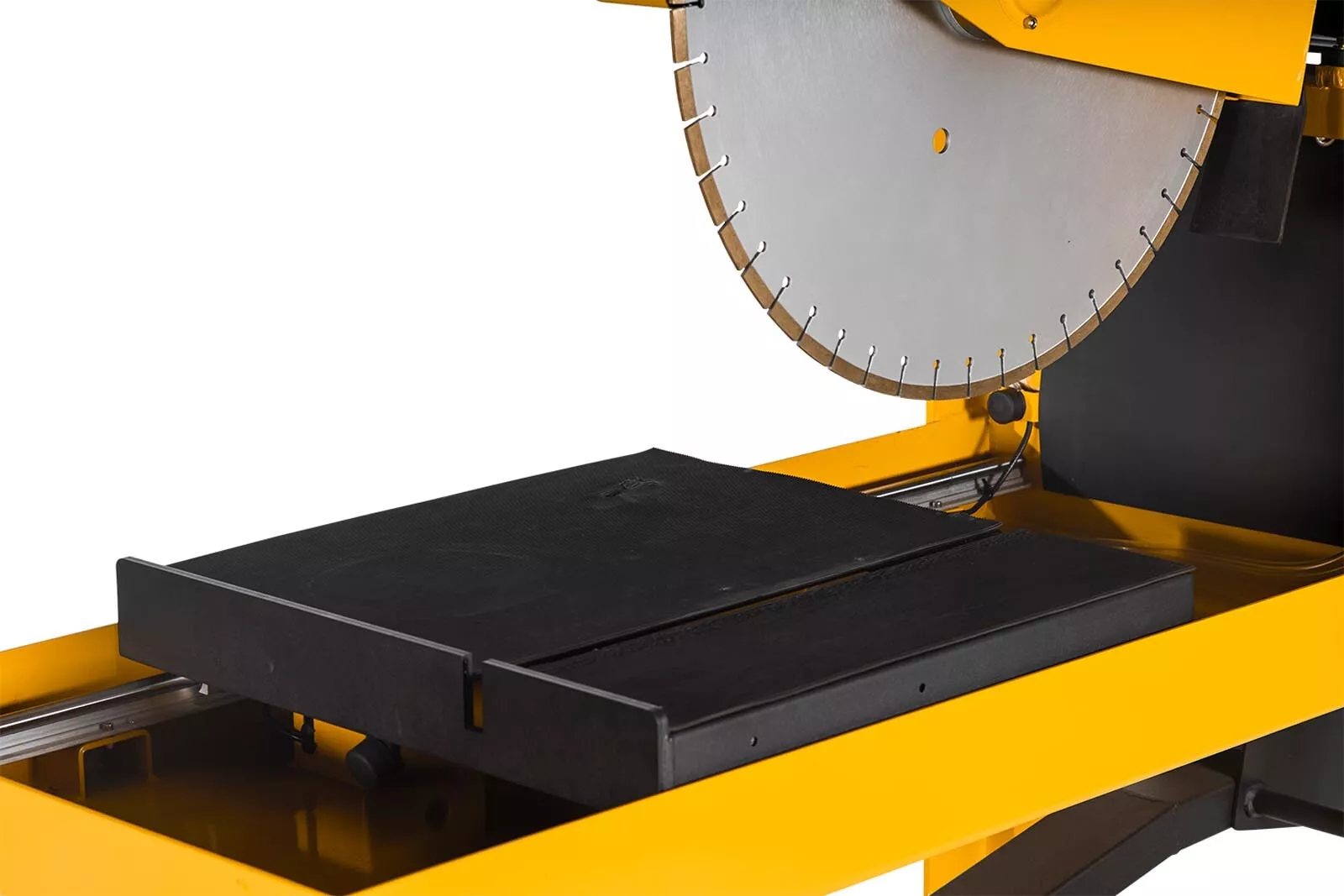 - Lehce pogumovaný posuvný stůl řezačky• Bezpečné díky ochrannému krytu řezného kotouče a klínového řemene