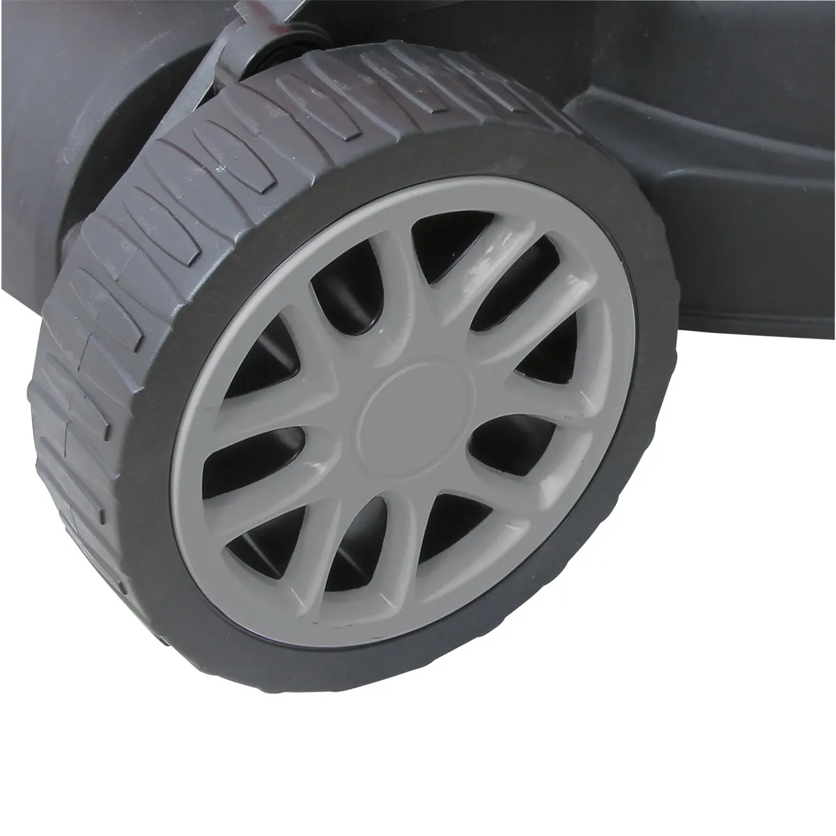 - Šasi je vyrobeno z odolného polypropylenového plastu, což činí sekačku znatelně lehčí a hlavně podvozek nepodléhá korozi. Celá sekačka je pak posazena na poctivých pojezdových kolech o průměru 150 a 200