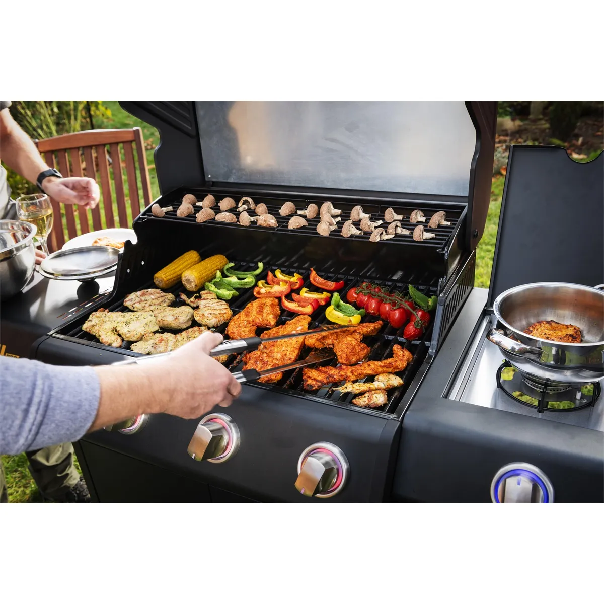 - užitečný boční vařič pro přípravu horkých nápojů, omáček nebo příloh lze snadno zakrýt vyklápěcím krytem a může sloužit jako druhý odkládací stolek