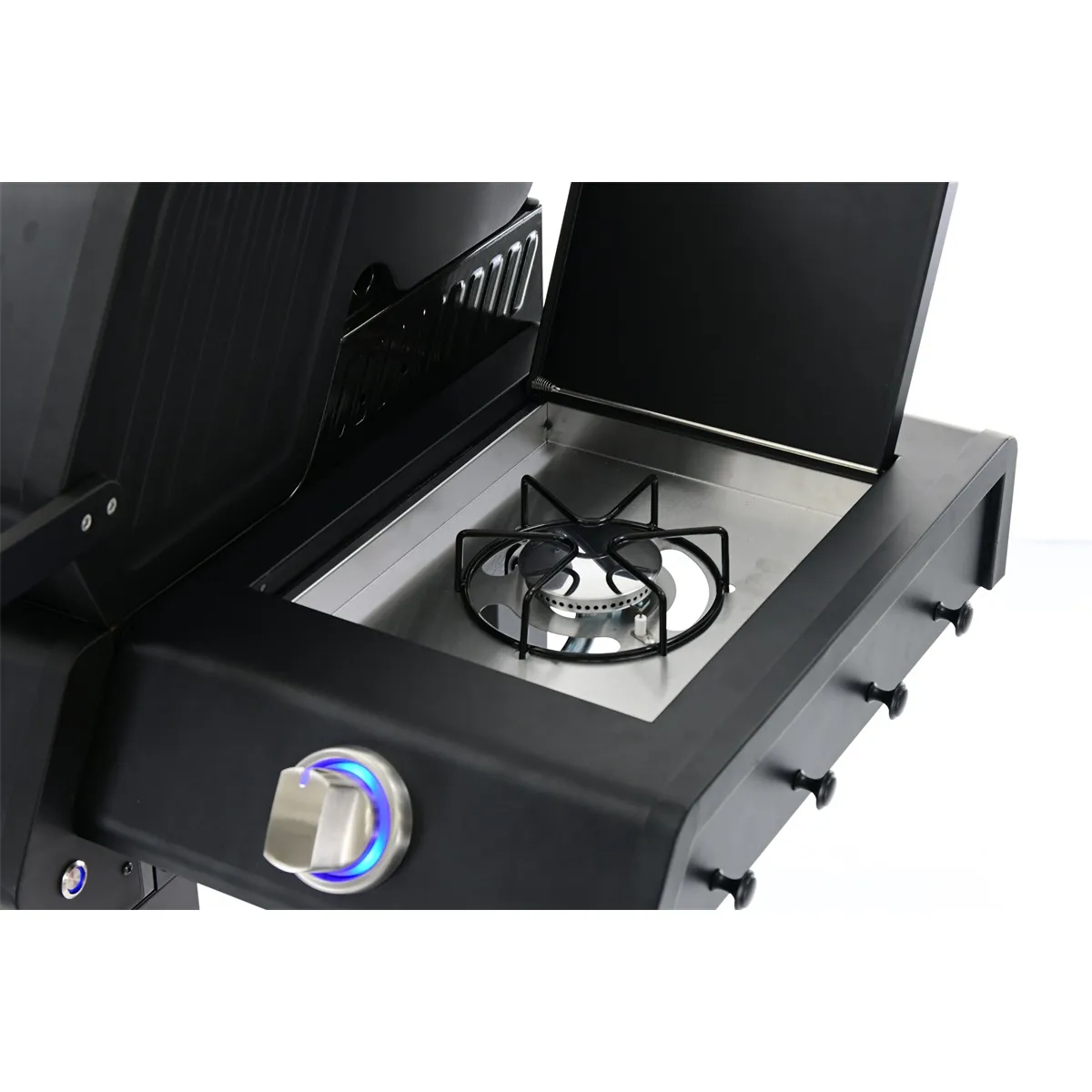 - užitečný boční vařič pro přípravu horkých nápojů, omáček nebo příloh lze snadno zakrýt vyklápěcím krytem a může sloužit jako druhý odkládací stolek