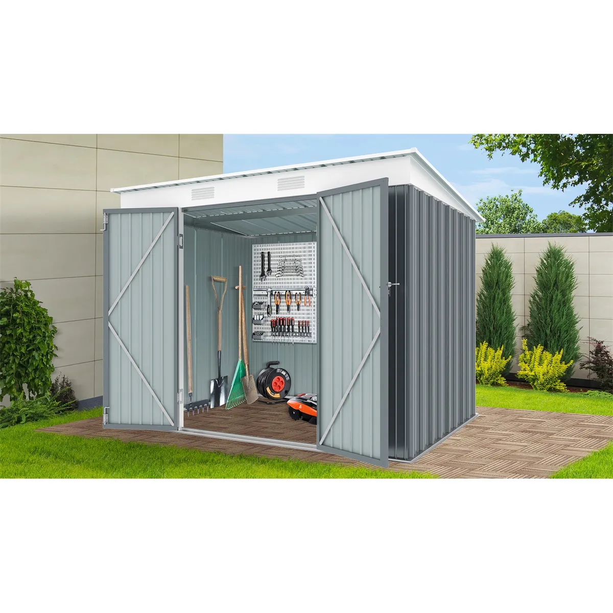 - praktický zahradní domek s rovnou pultovou střechou ideální pro uskladnění zahradní techniky a nářadí, grilovacích potřeb, zahradního nábytku, sportovního náčiní, hraček atd.