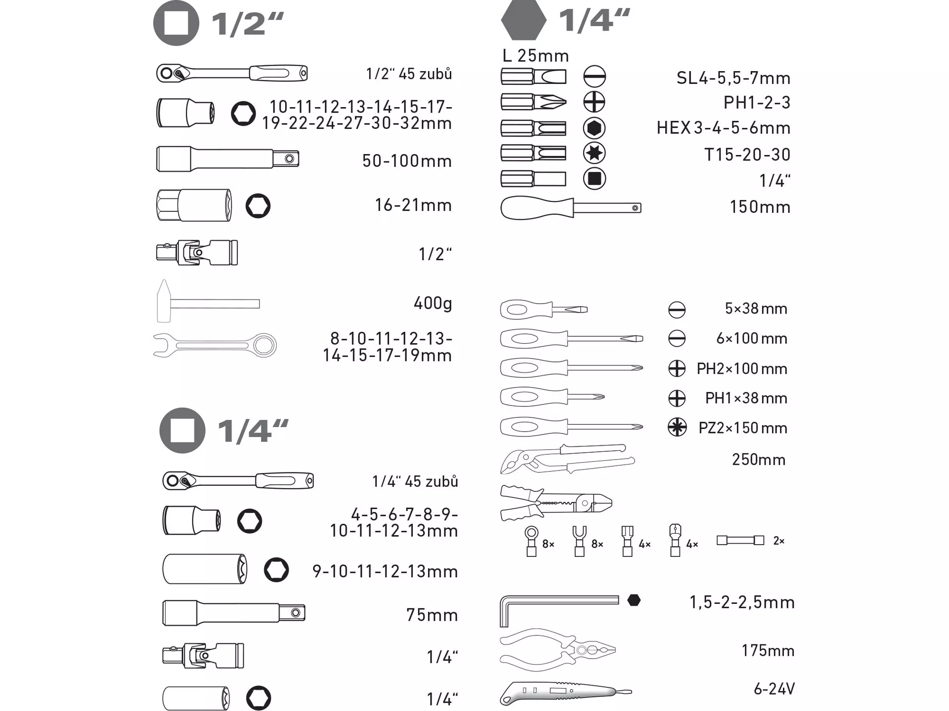 - Hlavice nástrčné: 1/4": 4-5-6-7-8-9-10-11-12-13mm, 1/2": 10-11-12-13-14-15-16-17-19-22-24-27-30-32mm