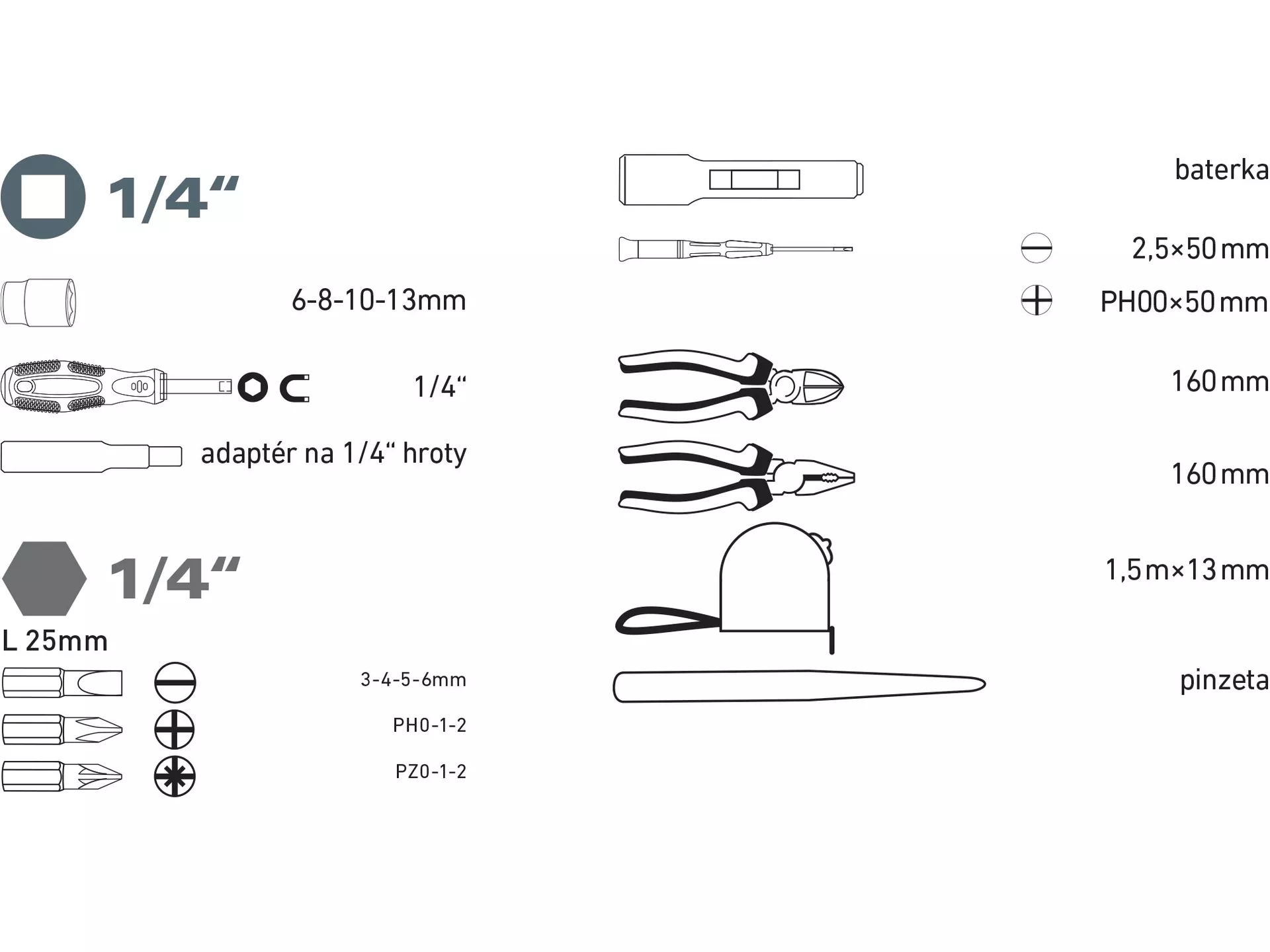 - Hroty: 1/4"(L25mm): (-)3-4-5-6mm, PH0-1-2, PZ0-1-2-2-3, H3-4-5-6mm, T10-15-20-25 (CrV)