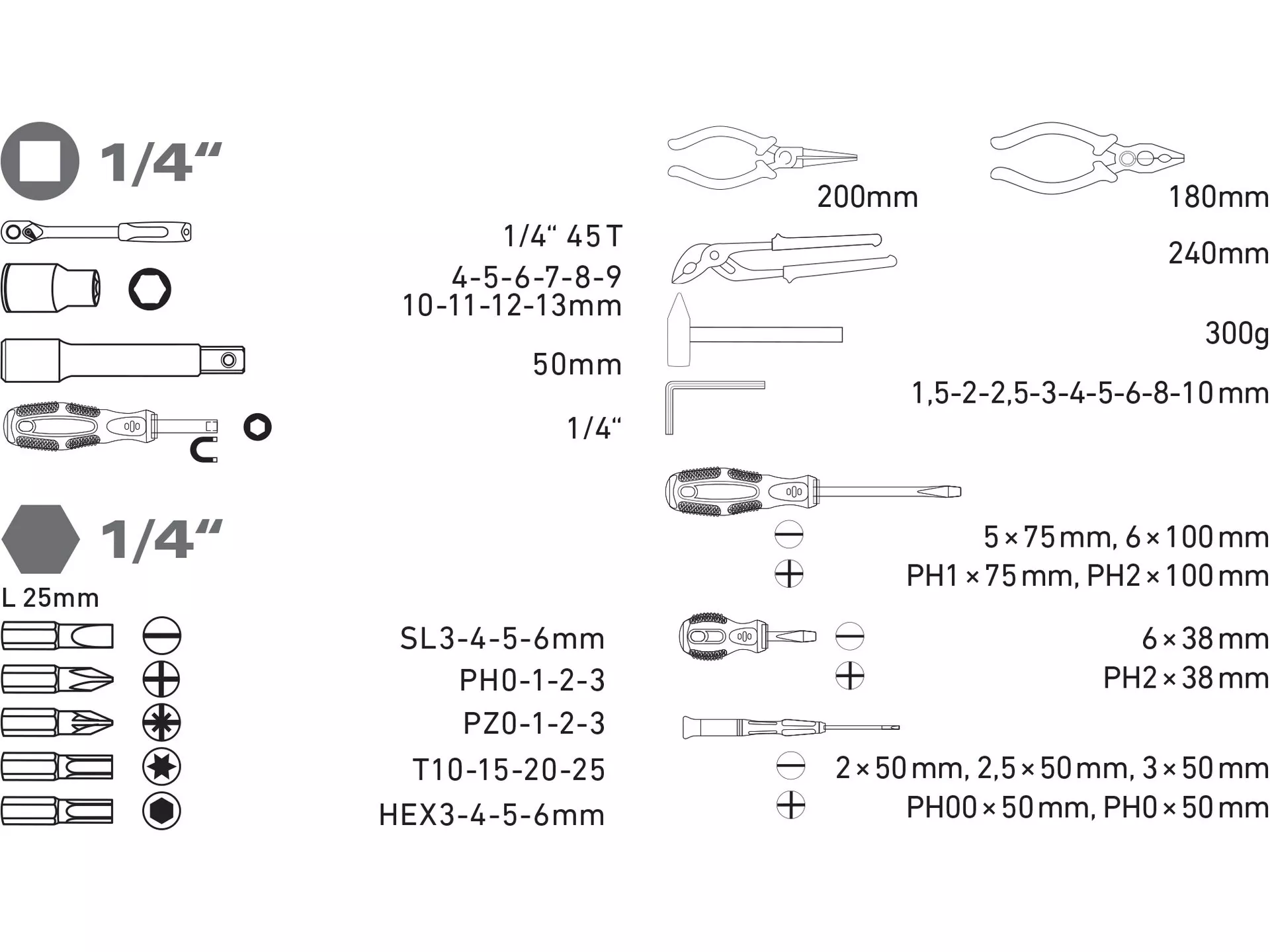 - Šroubovák: (-)5x75mm, (-)6x100mm, (-)6x38mm, PH1x75mm (CrV), PH2x100mm, PH2x38mm,magnetický šroubovák na hroty 1/4"x100mm