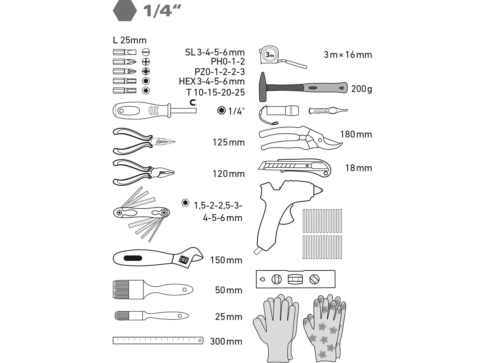 - Hroty: 1/4"(L25mm): (-)3-4-5-6mm, PH0-1-2-3, PZ0-1-2-3, H3-4-5-6mm, T10-15-20-25 (CrV)