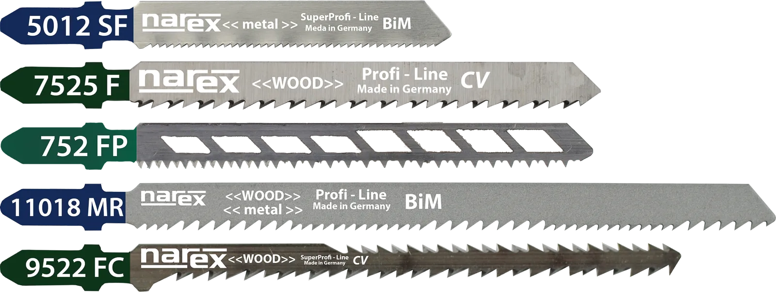 - 1× SBN 5012 SFocelové plechy, nerezová ocel, neželezné kovy, čisté přímé řezy1× SBN 7525 Fměkké dřevo, konstrukční dřevo, překližka, MDF, dřevotřískové desky, laťovky, velmi čistý přímý řez1× SBN 752 FPměkké a tvrdé dřevo, konstrukční dřevo, překližka, MDF, laťovky, dřevovláknité desky, beztřískové čisté řezy1× SBN 11018 MRměkké a tvrdé dřevo, sendvičové materiály, dřevo s hřebíky, nerezová ocel, ocelový plech, neželezné kovy, středně hrubý přímý řez, dlouhý plátek1× SBN 9522 FCměkké dřevo, překližka, multiplex, lepené dřevo, MDF, laminát, speciální pilový plátek s oboustranným ozubením pro extrémní křivky, rychlý a čistý řez