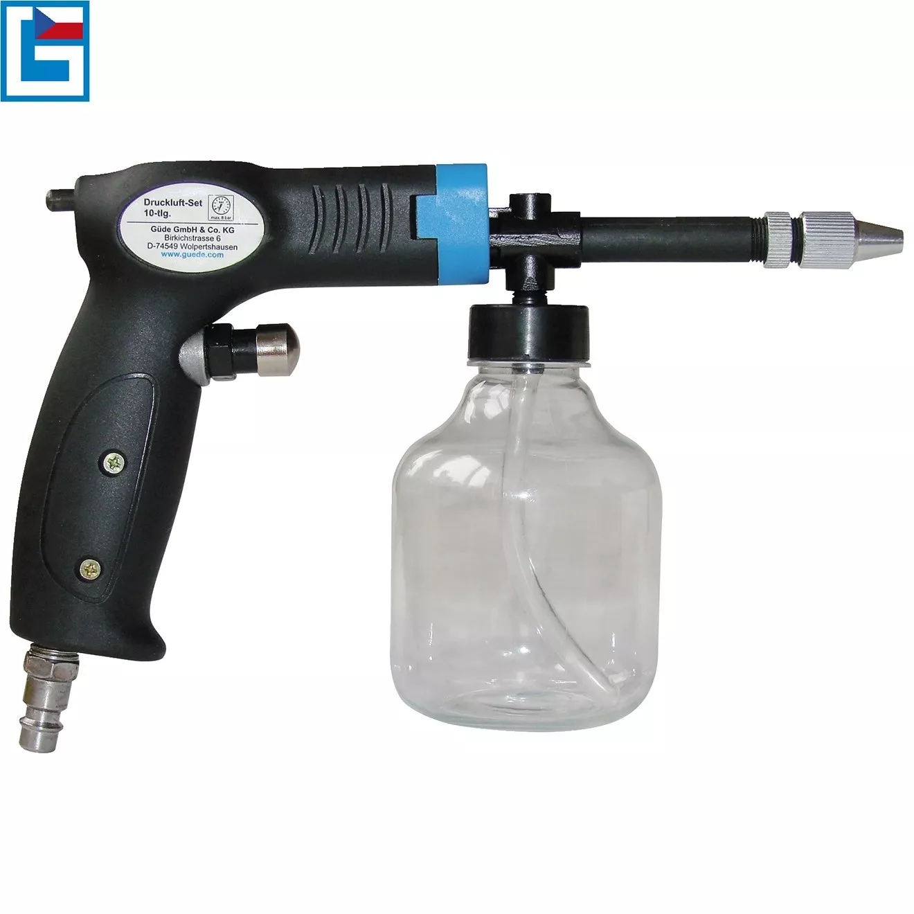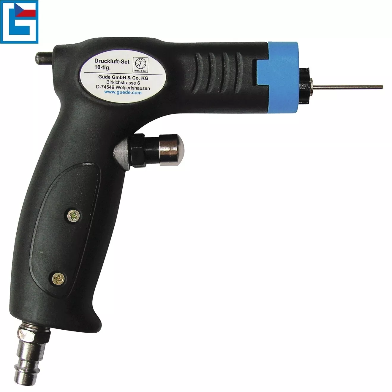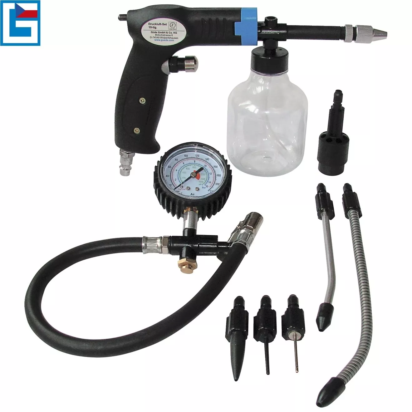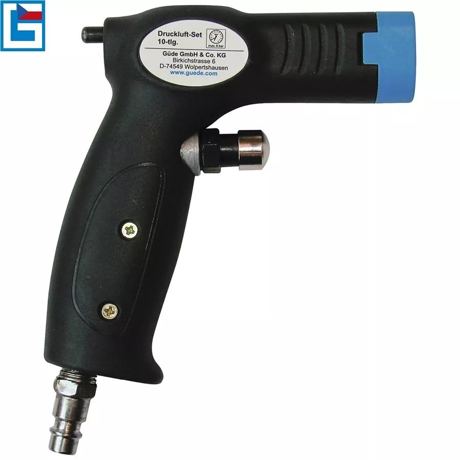- Složení sady: vzduchová pistole, foukací trysky různých tvarů a určení (6), hustilka s manometrem, stříkací tryska vč