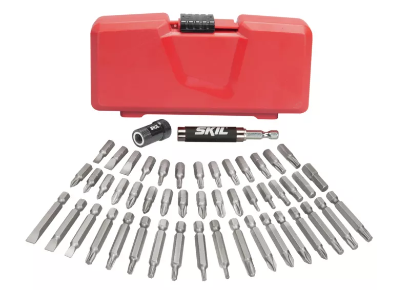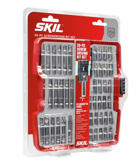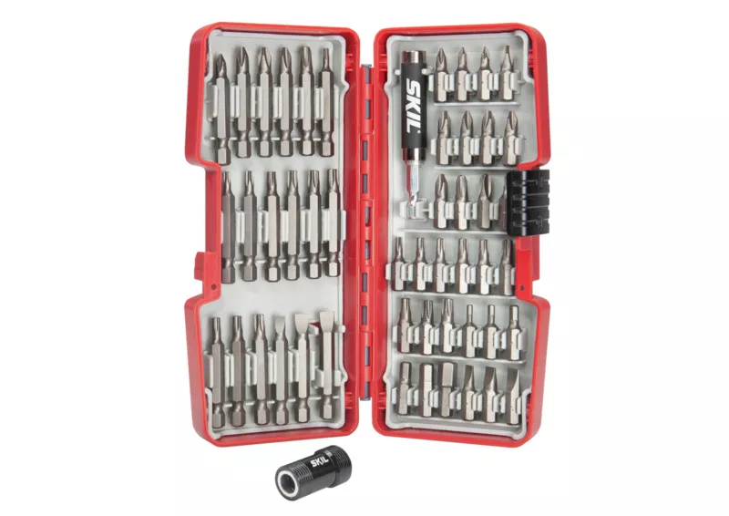 - Magnetický držák bitů „BIT GRIP™“. 18dílná sada 50 mm univerzálních šroubovacích bitů. 30dílná sada 25 mm šroubovacích bitů (Philips, drážka, Torx, šestihran). 60 mm magnetický držák šroubovacích bitů.