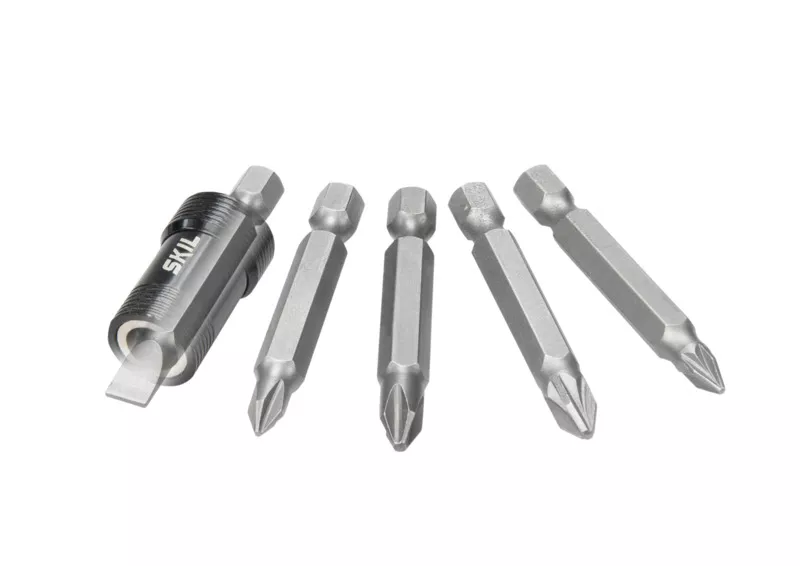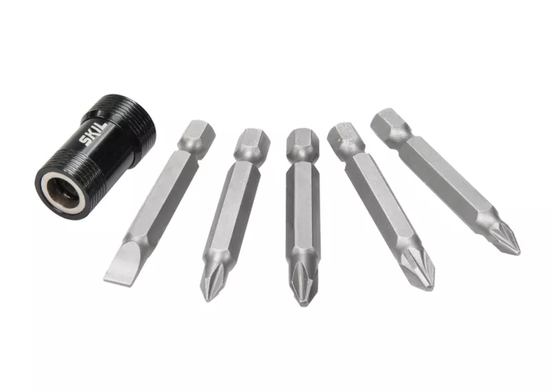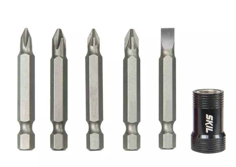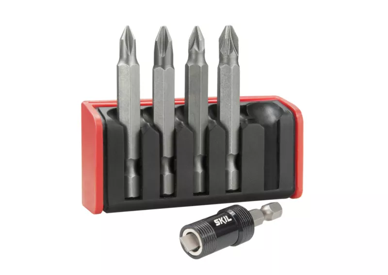- Magnetický držák bitů „BIT GRIP™“. 5dílná sada 50mm univerzálních šroubovacích bitů (PH1, PH2, PZ1, PZ2, SL6).
