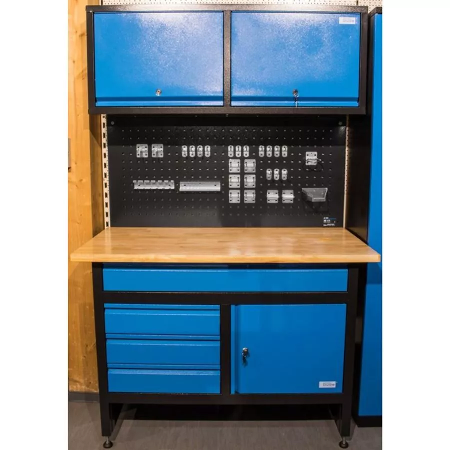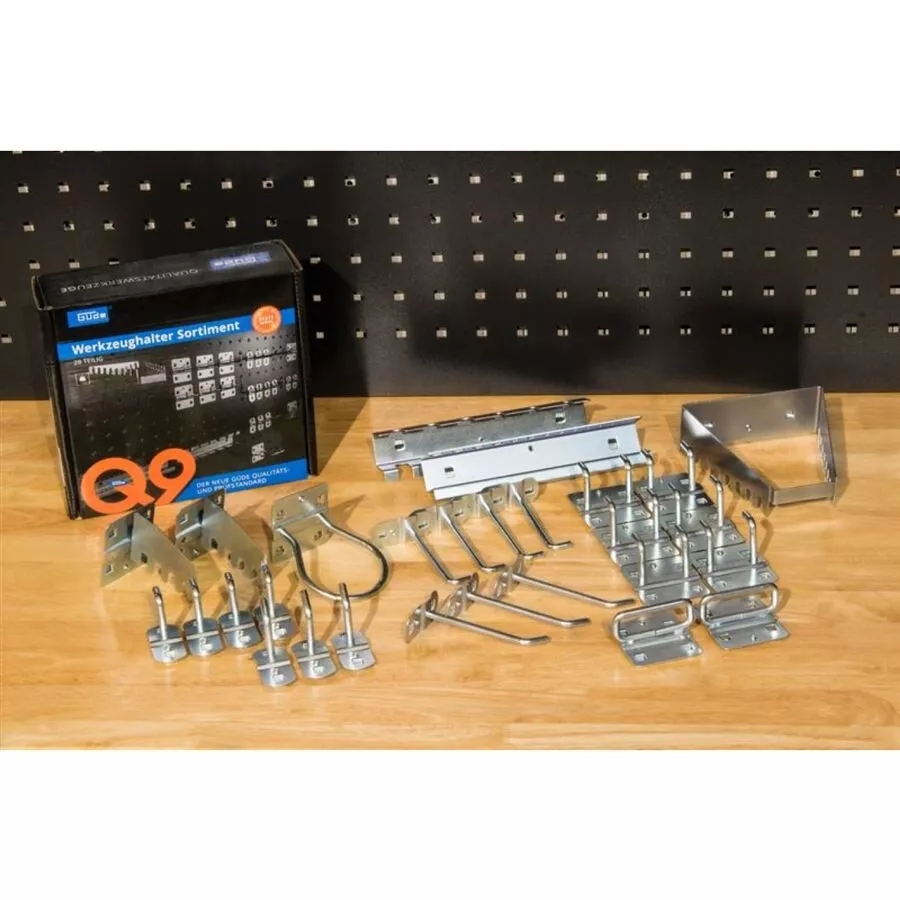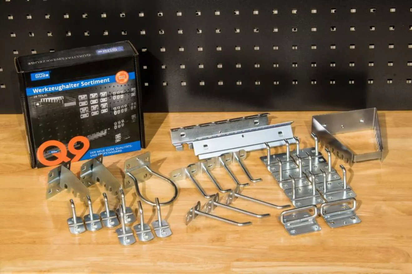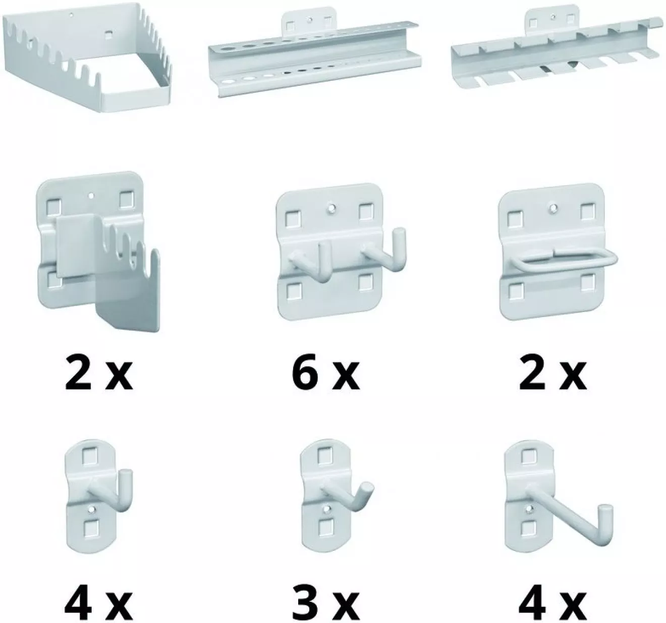 - Sada 28 háků a držáků, kompatibilní s dílenskými závěsnými systémy, které využívají čtvercové děrování 10 mm2 při vertikální/horizontální vzdálenosti středů otvorů 38 mm.