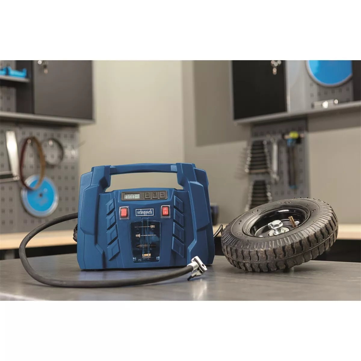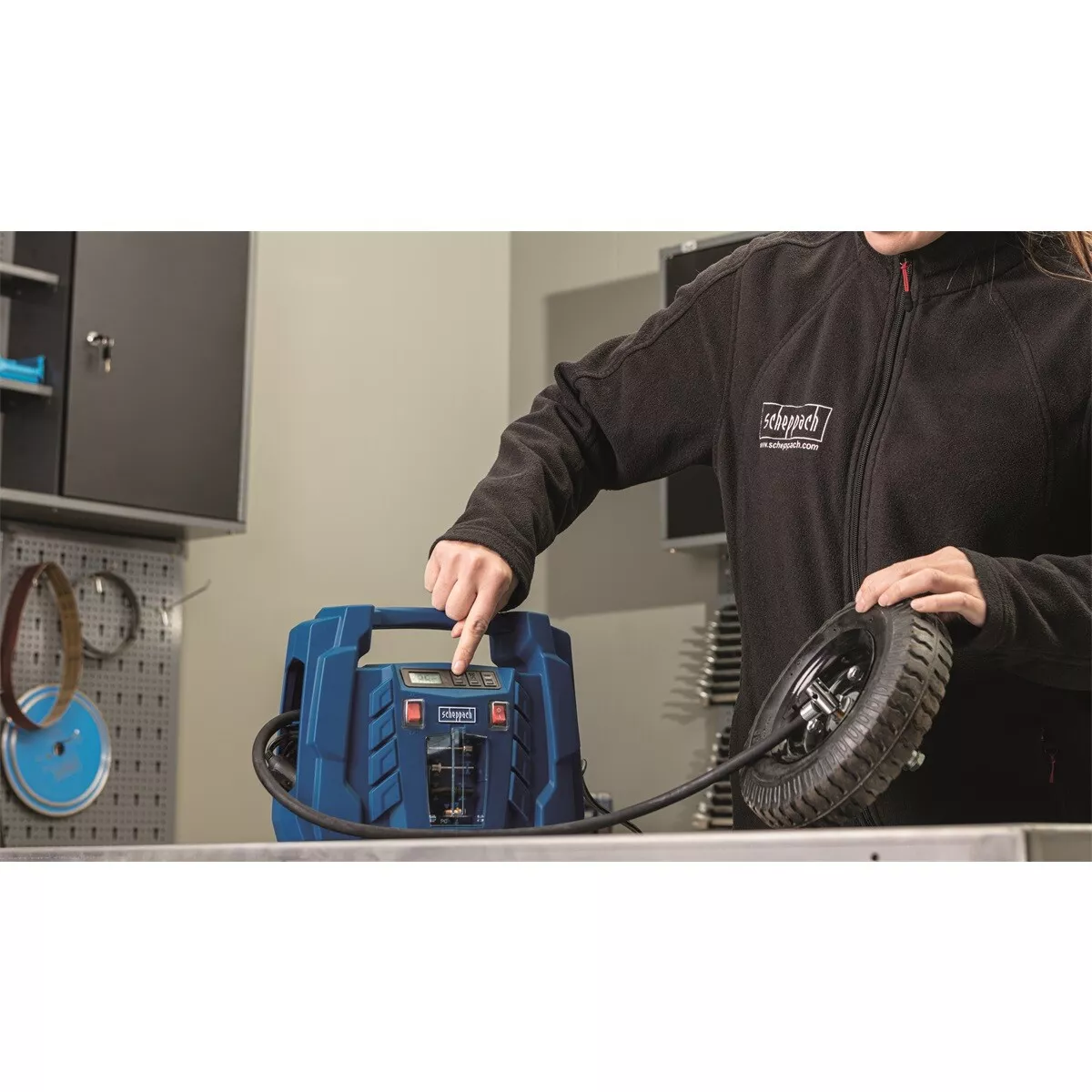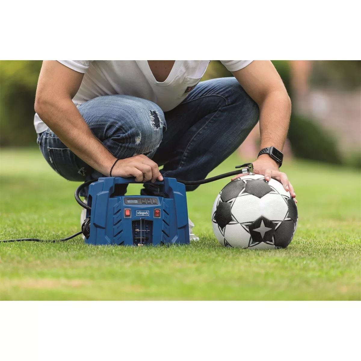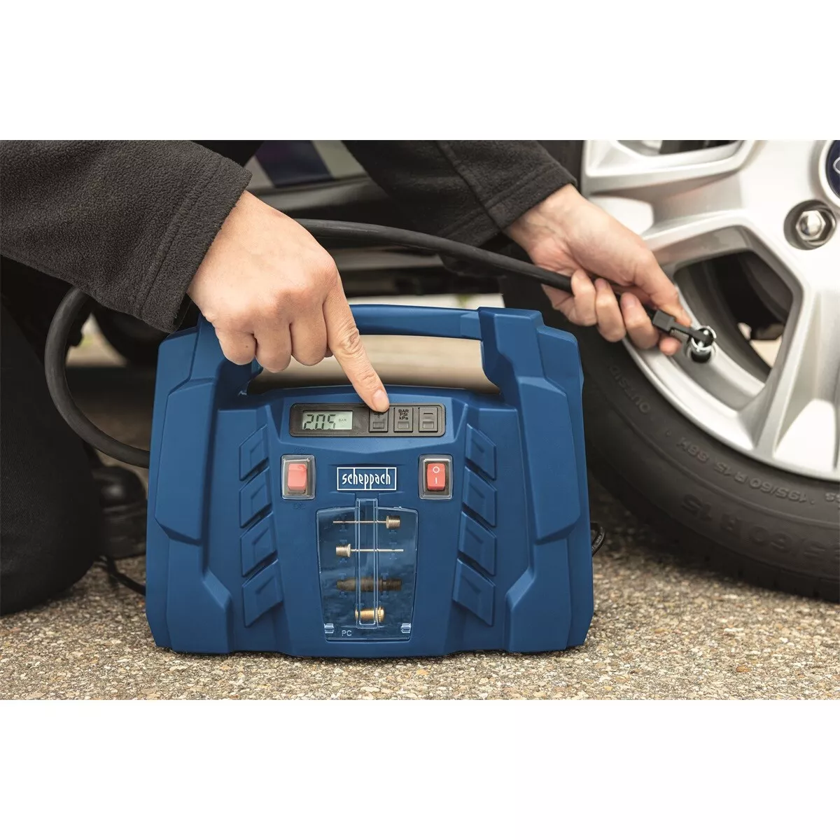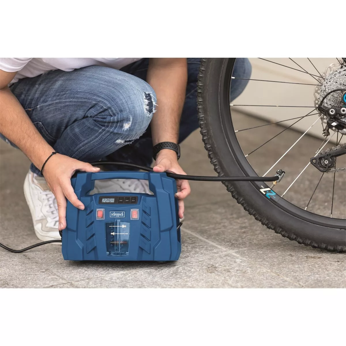 - Kompresor Scheppach AIR FORCE 5 je malý, ale užitečný pomocník, kterého můžete napájet jak z běžné sítě na 230 V, tak i z běžné automobilové zásuvky na 12 V. Uplatní se tak nejenom jako praktický, skladný, a lehký kompresor ve vaší dílně nebo garáži, ale využijete ho i na cestách v autě nebo karavanu. Obsluha je velmi jednoduchá. Na digitálním displeji vidíte aktuální hodnotu tlaku. Ten si jde rovněž v rozmezí 0,1 až 8 bar předvolit a po dosažení nastaveného tlaku se kompresor automaticky vypne. Díky velkému množství různých koncovek a maximálnímu tlaku až 8 barů si hravě poradí s foukáním pneumatik motocyklů, kol, aut, terénních čtyřkolek, míčů, matrací, nafukovacích člunů, raftů apod. Veškeré příslušenství, včetně dvou elektrických kabelů, tlakové hadice 0,6 m a čtyř různých koncovek je chytře ukryto uvnitř kompresoru, takže se Vám nic neztratí. Pohodlné madlo usnadní přenášení. Kompresor je vybavený nejmodernějším motorem s bezolejovou technologií. Kontrola oleje, jeho doplňování nebo výměna tak vůbec není potřeba a kompresor je tak vždy připravený odvést svoji práci. Jeho rozměry a váha pouhých 1,9 kg ho rovněž předurčují k využití při stanování, kempování a jiných outdoorových aktivitách.