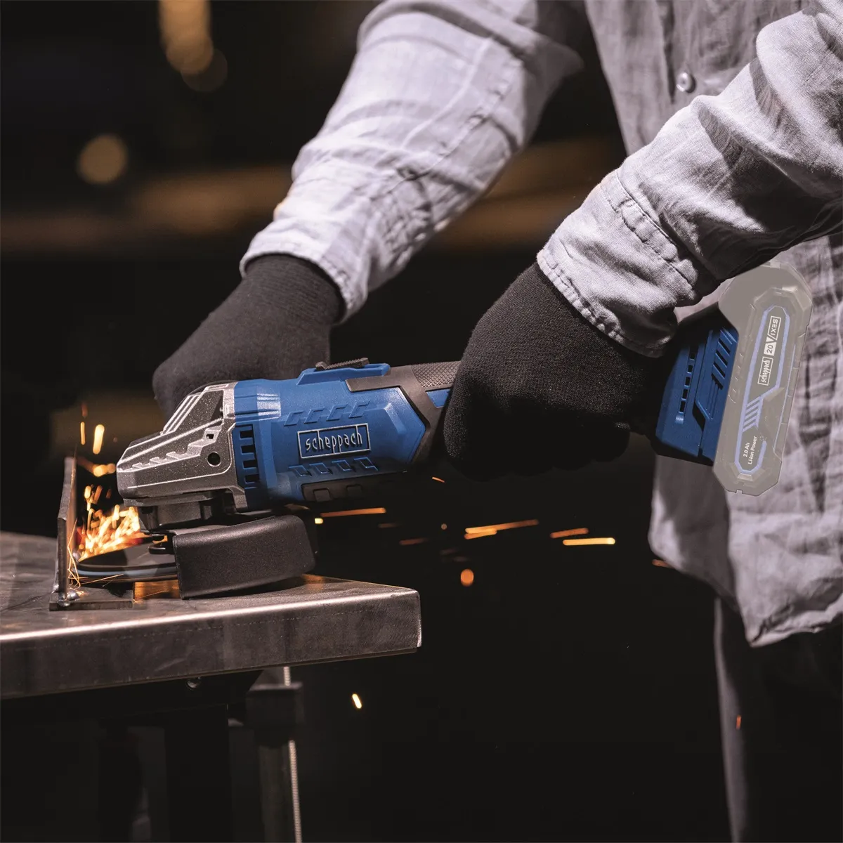 - Výkonná aku úhlová bruska Scheppach C-AG125-X je skvělým pomocníkem pro řezání, broušení i leštění. Její štíhlé tělo s hliníkovou přední částí a měkkými zónami úchopu umožňuje snadnou práci i v úzkých prostorách. Bezpečnost při práci zvyšuje ochranný kryt, který lze snadno nastavit bez použití nářadí.