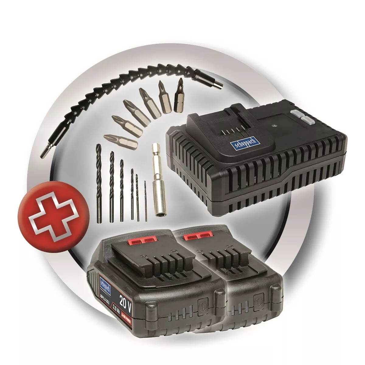 - 2 x 2 Ah akumulátor, rychlonabíječka 4 Ah, 6 ks šroubovacích bitů, 6 ks vrtáků, 1x držák bitů, 1 x flexibilní držák bitů pro práci v nepřístupných prostorech, plastový kufr