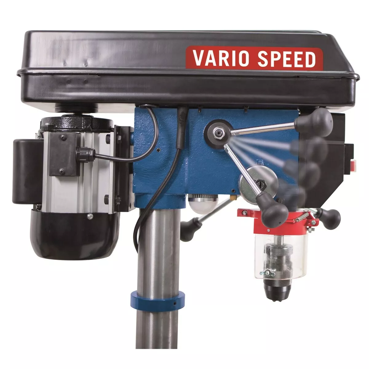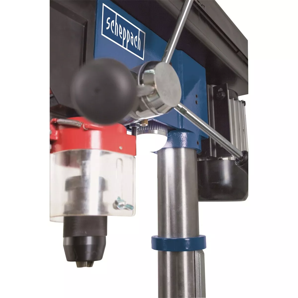 - Stojanová vrtačka Scheppach DP 18 VARIO je nadstandardně vybavený model stojanové vrtačky vhodný hlavně pro náročné domácí kutily, řemeslníky, do menších dílen ap. Vybrat si tu správnou rychlost pro zvolený druh materiálu je u tohoto stroje hračka. Jednoduchým pohybem páky na levé straně stroje si měníte plynule rychlost vrtání. Tu Vám navíc indikuje digitální display na čele stroje. Můžete tak bez obav vrtat do kovů, plastu nebo měkkého i tvrdého dřeva. Dalšími prvky, které usnadňují a zpříjemňují ovládání vrtačky je křížový laser, který umožní snadnou orientaci při vrtání a urychlí práci při vrtání větších sérií obrobků. Dále je to světlo, osvětlující pracovní část plochy a výsuvné rozšíření stolku s rolnou, které se hodí při práci s delšími obrobky. Stroj má robustní ocelovo-litinovou konstrukci, rychloupínací sklíčidlo 16 mm ve standardu a silný motor 550 W, který si poradí s jakýmkoliv materiálem. Vrtačku můžete za příplatek dovybavit i svěrákem. Stroj samozřejmě splňuje poslední požadavky evropské unie na bezpečnost, jako je např. hlavní vypínač umístěný na čele stroje, průhledný kryt sklíčidla ap. Stroj je umístěn na stabilním podstavci s možností pevného uchycení šrouby k pracovní desce nebo podlaze. Upnutí vrtáku je možné buď pomocí tradičního sklíčidla nebo pomocí morse kuželu (MK2).