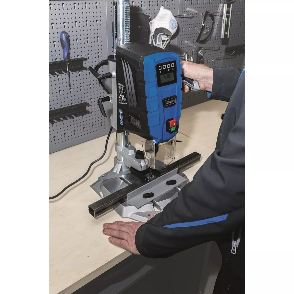 - Scheppach DP 55 představuje moderní a uživatelsky přívětivé pojetí stojanové vrtačky vhodné do každé domácí dílny. Stroj je velmi přesný a intuitivně se ovládá. Díky silnému motoru a plynulému elektronickému nastavení rychlosti otáček, si vždy zvolíte ideální parametry vrtání, které se zobrazují na digitálním displeji. Spolu s nastavitelnou hloubkovou zarážkou tak můžete vrtat libovolný počet stejně hlubokých děr. Přesnost práce vám zvýší i přesný křížový laser, velké otočné madlo s měkčenou protiskluzovou úpravou a kvalitní sklíčidlo. Pracovní stůl je jednak vybaven rychloupínací svorkou, která umožňuje sevřít obrobky různých tvarů a dále drážkami, do kterých lze upnout příslušenství, jako například standardně dodávané paralelní vodítko. Stroj samozřejmě splňuje poslední požadavky evropské unie na bezpečnost, jako je např. hlavní vypínač umístěný na čele stroje, průhledný kryt sklíčidla ap. Stroj je umístěn na stabilním podstavci s možností pevného uchycení šrouby k pracovní desce.
