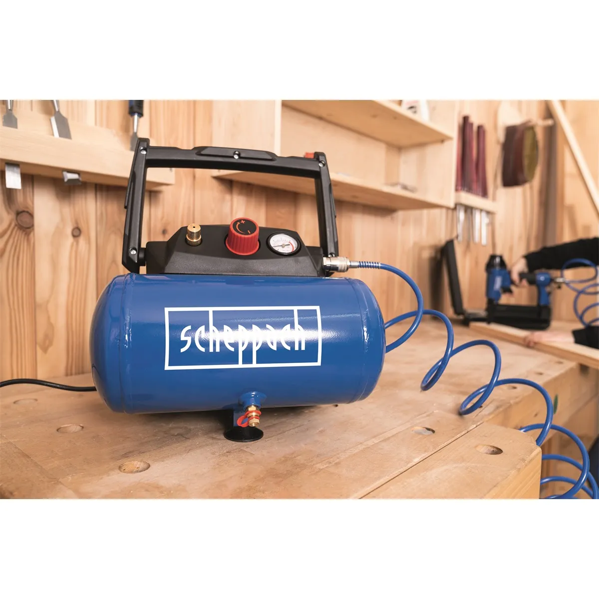 - Kompresor Scheppach HC 06 je praktický, lehký a snadno přenosný kompresor s tlakovou nádobou o objemu 6 l a silným motorem 1200 W. Díky moderní bezolejové technologii má minimální nároky na údržbu. Hodí se jak do běžných domácích dílen, tak i pro řemeslníky, pro které je důležitým kritériem nízká váha, malá hmotnost a snadný transport. Díky vzdušníku se kompresor hodí nejenom na běžné nafukování pneumatik, míčů, matrací, jízdních kol, ale můžete k němu připojit i sponkovačku, stříkací pistoli (air brush), ofukovací pistoli apod. Díky bezolejové technologii je vhodný i na tlakování výčepních zařízení. Výši tlaku si jednoduše nastavíte otočným ovladačem a jednoduše kontrolujete pomocí vestavěného manometru. Stroj je vybaven velkým madlem, háky pro snadné namotání přípojného kabelu a pro dobrou stabilitu i nohami s gumovými patkami. Kompresor je už v základu vybaven bohatou sadou šestidílného příslušenství, takže ho můžete bez dalších finančních výdajů začít ihned používat. Nástroje šestidílné sady jsou vyrobeny z kvalitních slitin kovů a snadno se připojí na rychlospojku kompresoru.